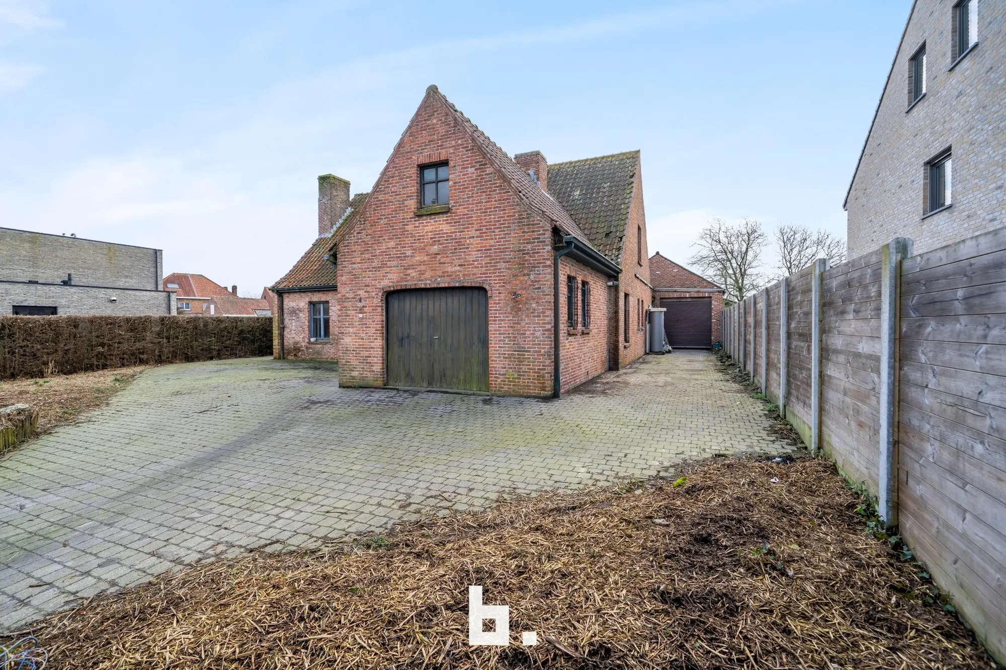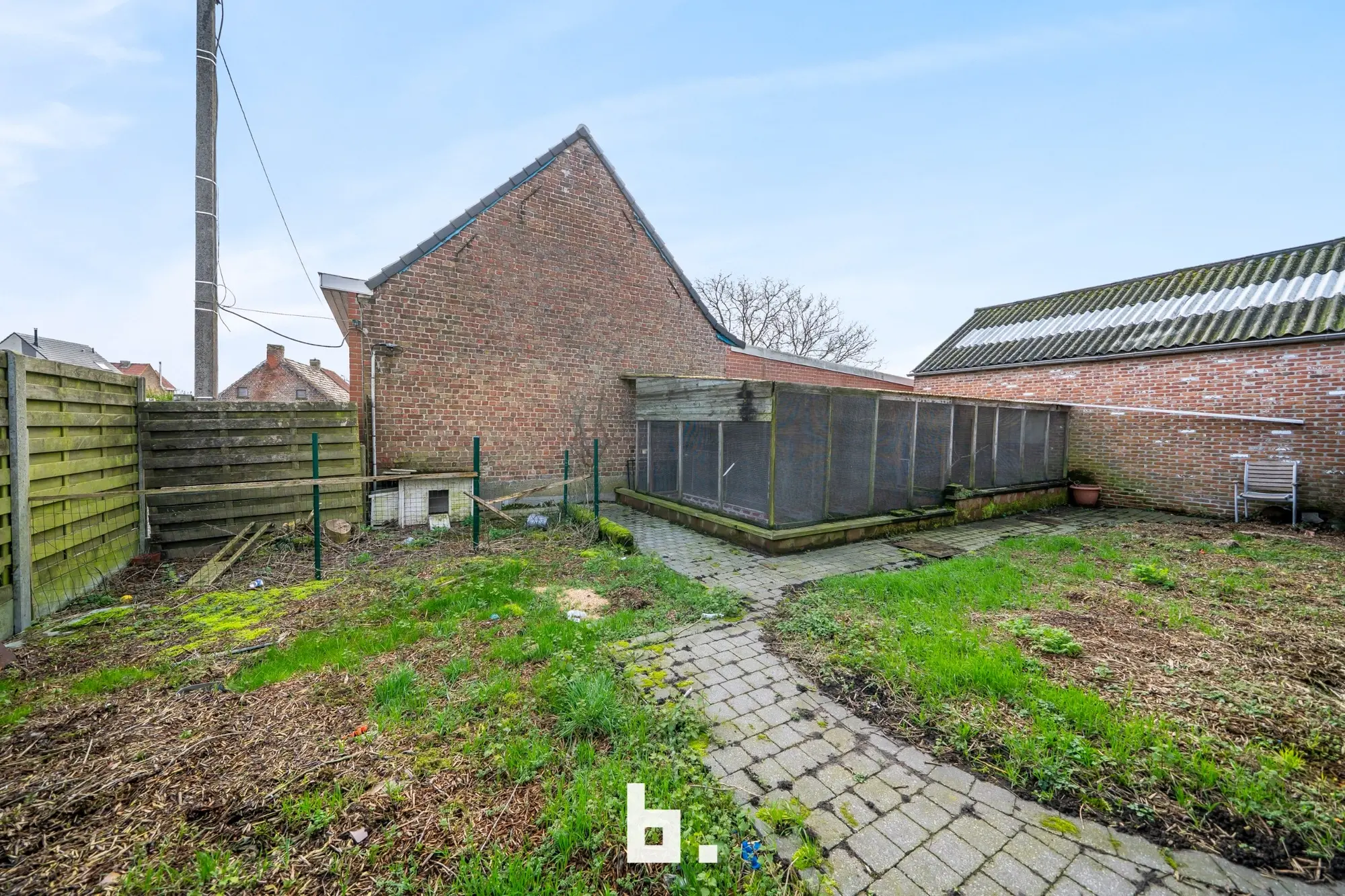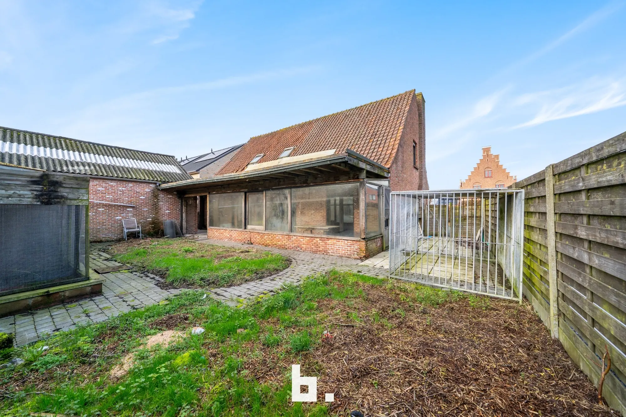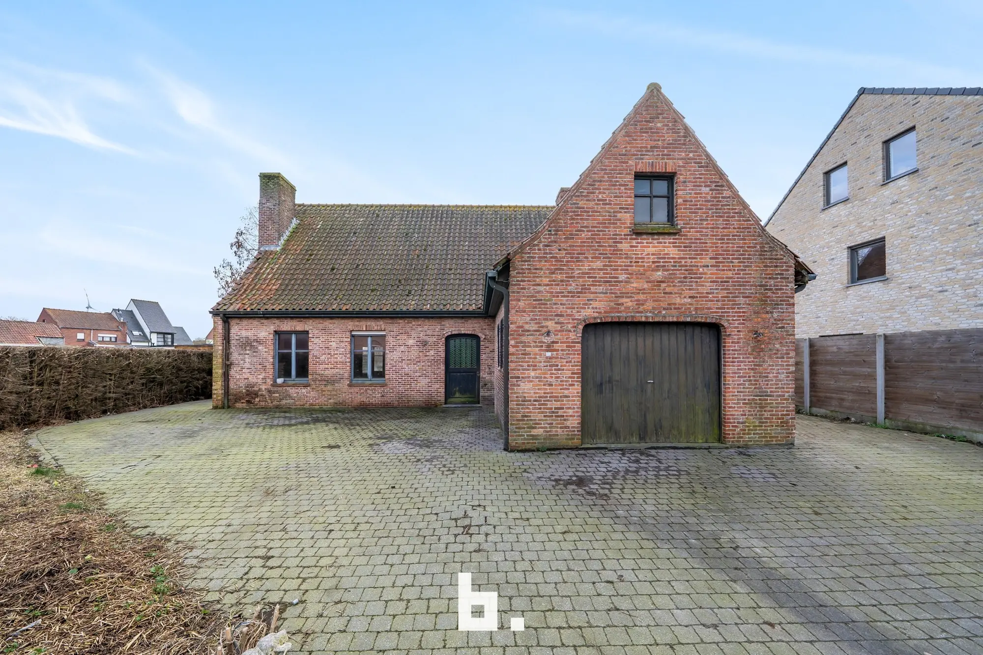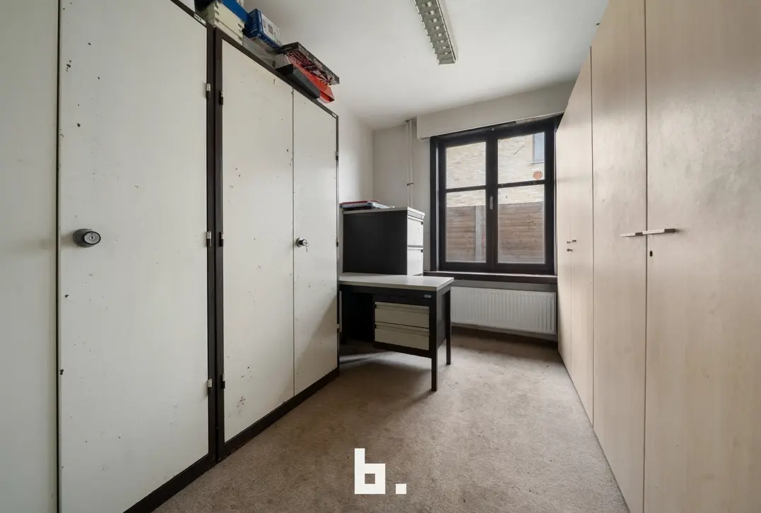 Indeling: Ruime oprit voor meerdere wagens, inkom, bureel, slaapkamer, woonkamer, keuken, toilet, ruim overdekt terras, tuin, garage en een ruime loods achteraan perceel.