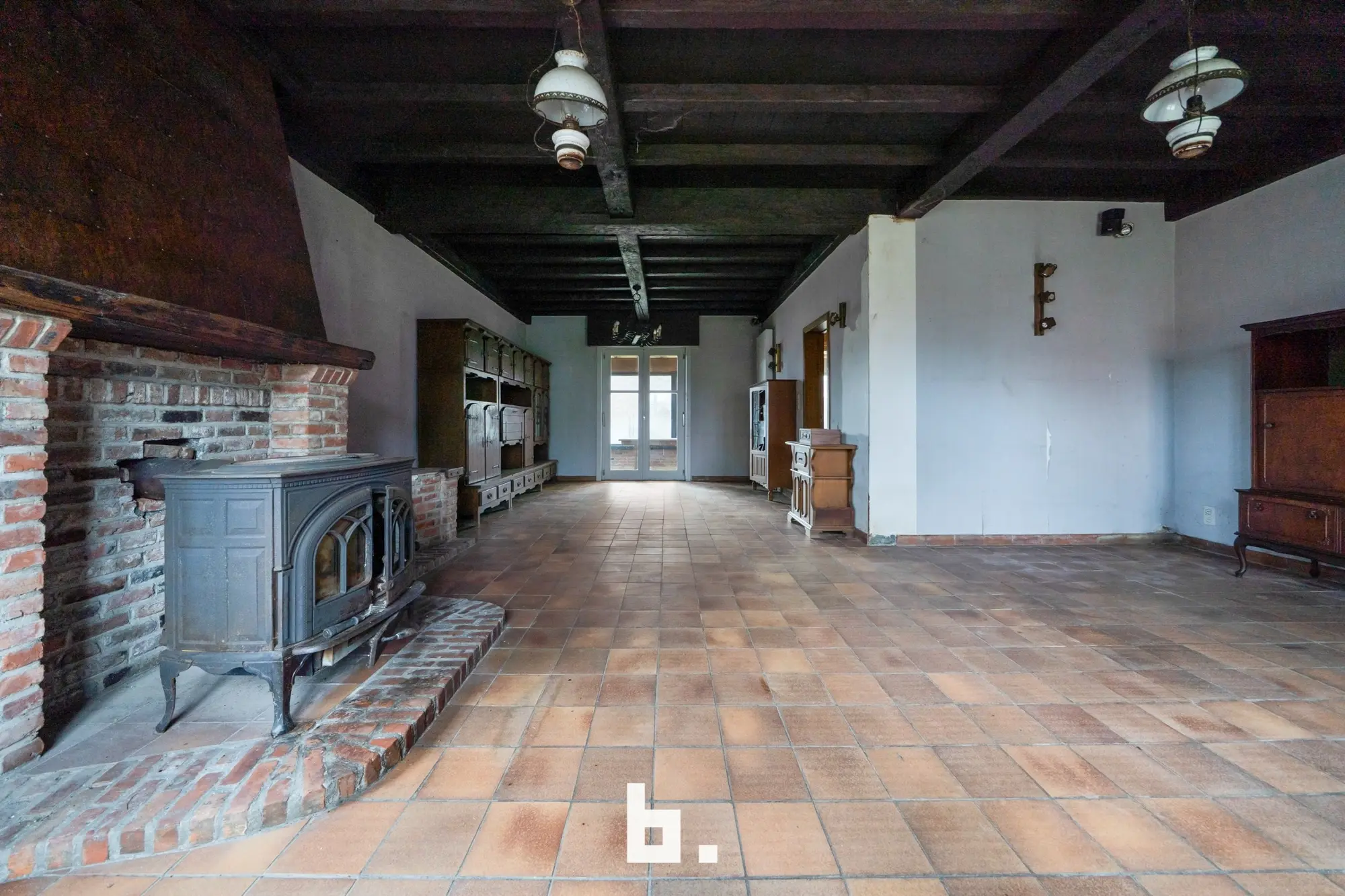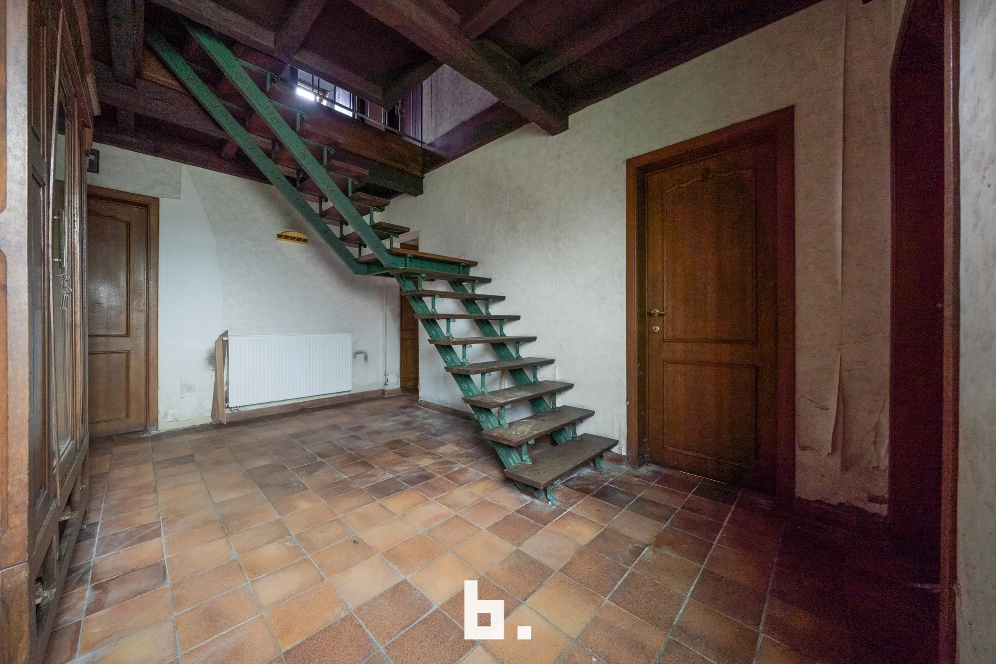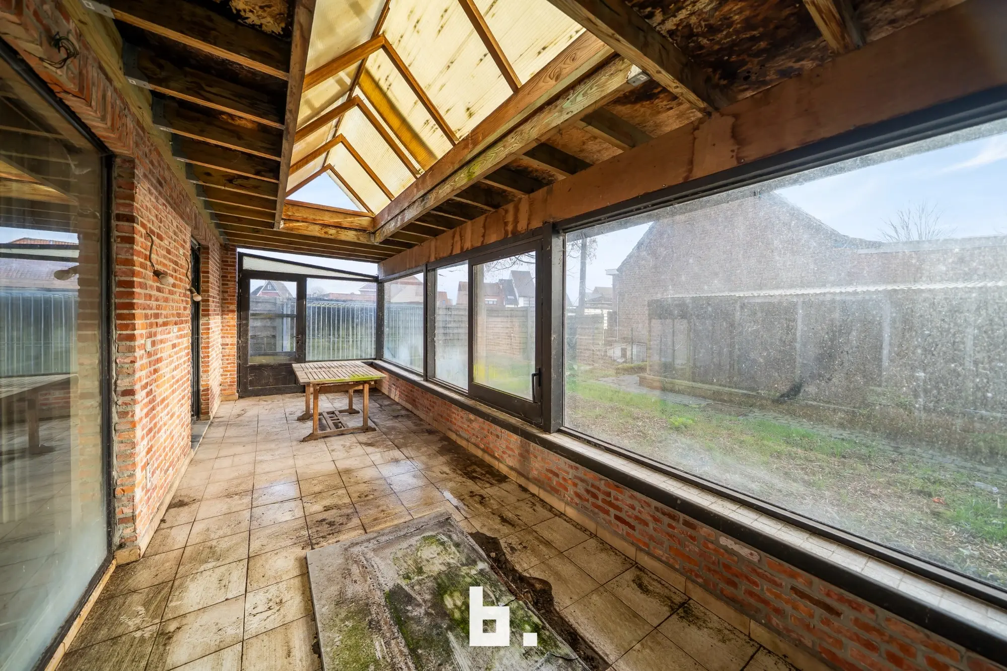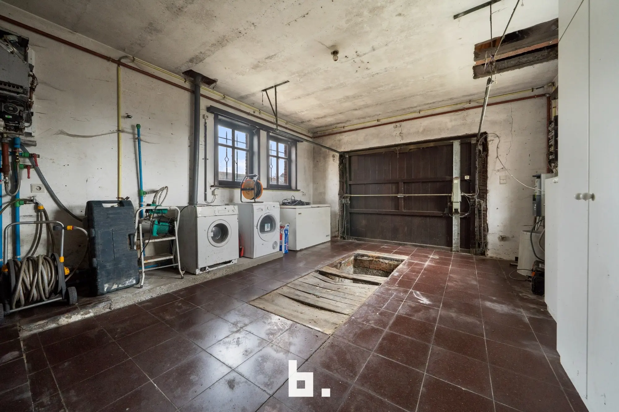 Indeling: Ruime oprit voor meerdere wagens, inkom, bureel, slaapkamer, woonkamer, keuken, toilet, ruim overdekt terras, tuin, garage en een ruime loods achteraan perceel.
