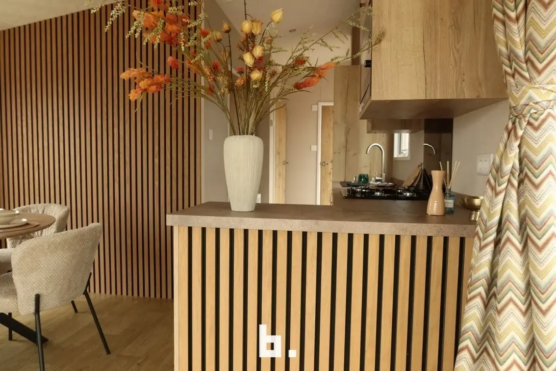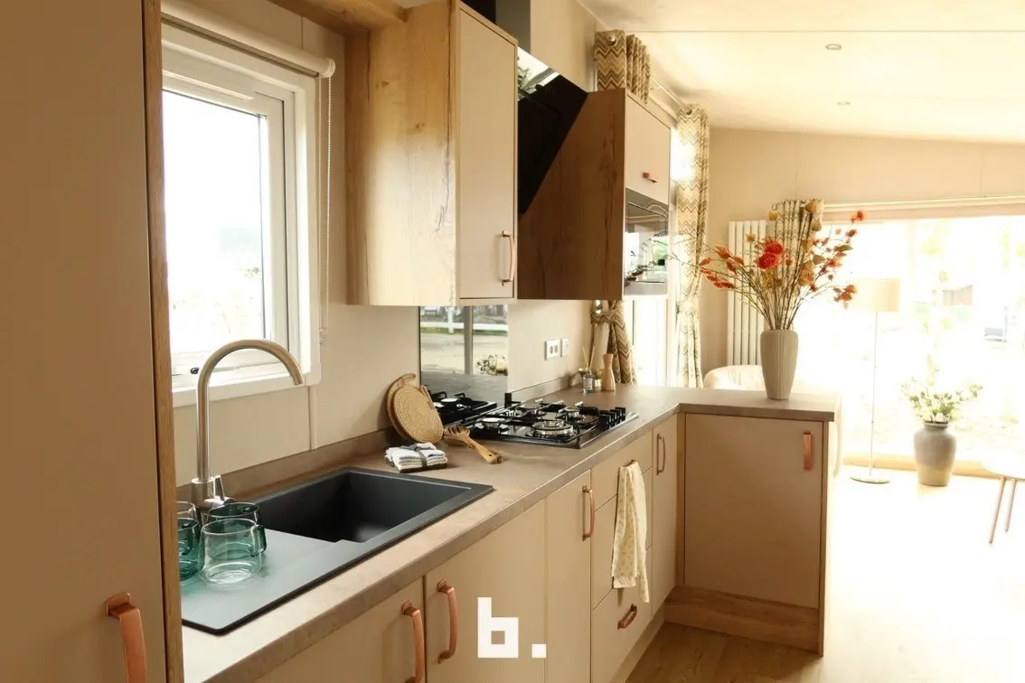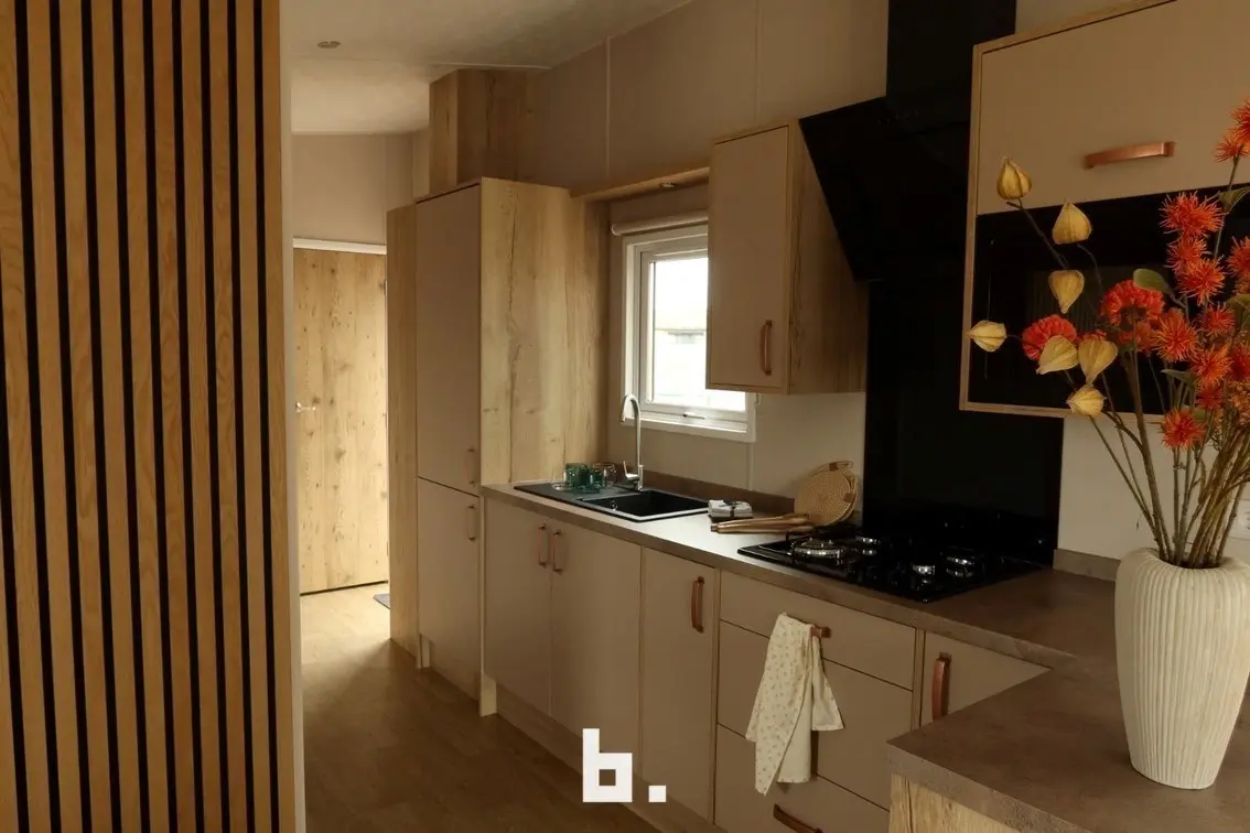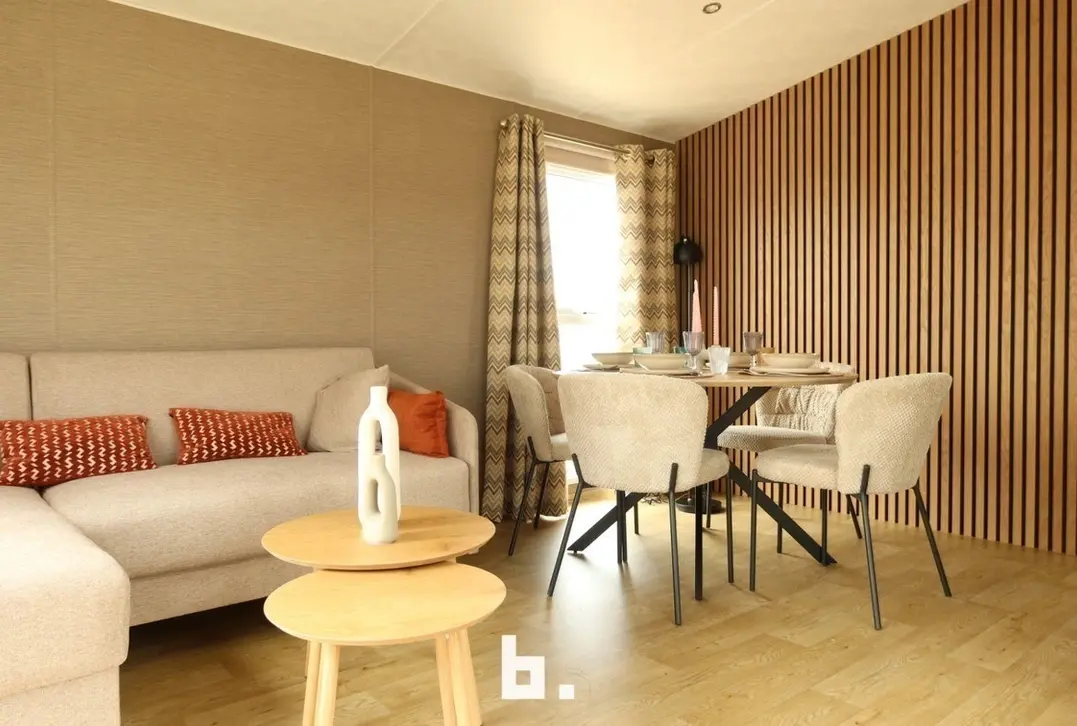 Nieuwe chalets (type Premium) op topligging vlak aan zee te Wenduine met mooie living met aansluitend terras, open ingerichte keuken, gasten toilet, badkamer met douche, lavabo en 3 slaapkamers, volledig bemeubeld met nieuwe meubels, ideaal voor vakantieverhuur of 2 de verblijf, geschikt voor 6 personen huur.