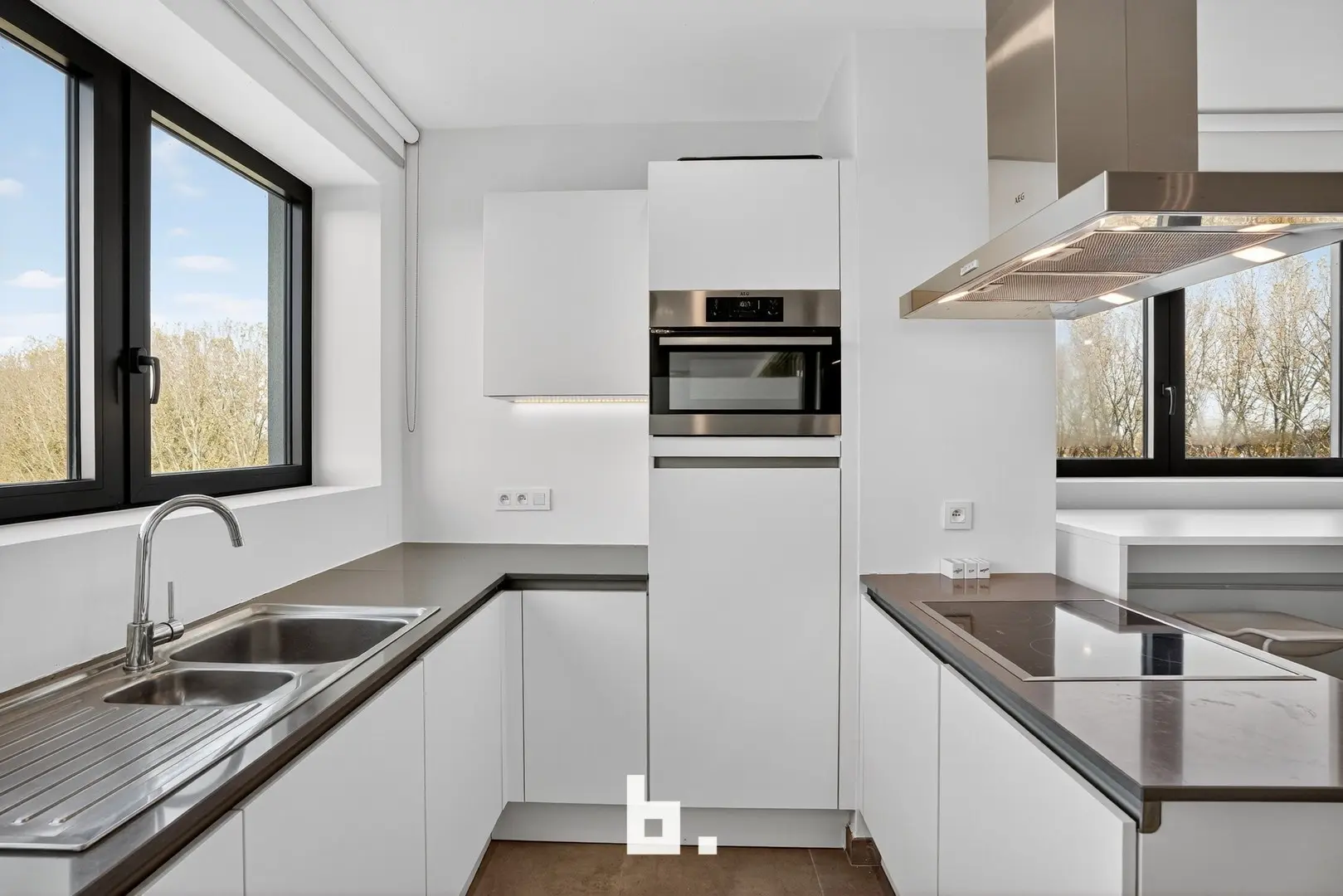 Bij het binnenkomen word je verwelkomd in de inkomhal die uitgeeft op een lichte en ruime leefruimte met open, volledig ingerichte keuken. De keuken is voorzien van alle comfort: koelkast, elektrisch kookfornuis, oven, vaatwas en dampkapafvoer – ideaal voor wie houdt van praktisch wonen met een moderne touch. Tevens heeft u van hieruit ook al zicht op de natuur waartussen het gebouw staat.