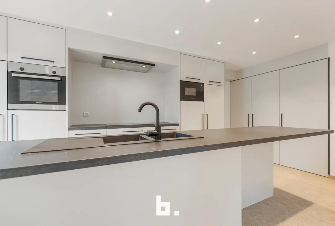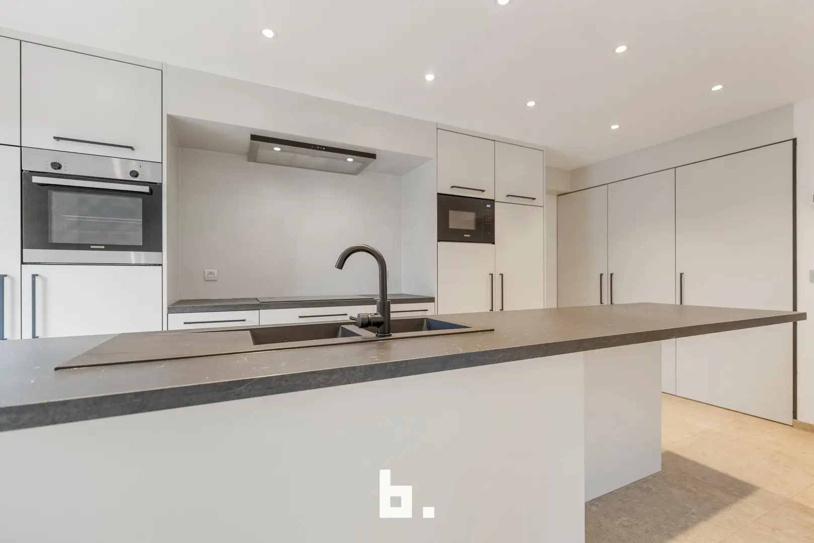 Bij het betreden van het appartement komt u binnen in een volledig vernieuwde, open keuken, afgewerkt met kwalitatieve materialen en uitgerust met toestellen van Siemens. Aansluitend bevindt zich de lichtrijke en ruime leefruimte, die rechtstreeks toegang biedt tot het zonnige terras van maar liefst 32 m² – ideaal om te ontspannen of gasten te ontvangen.