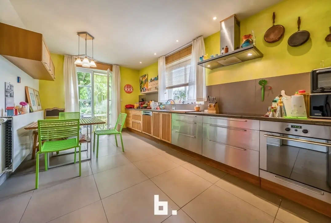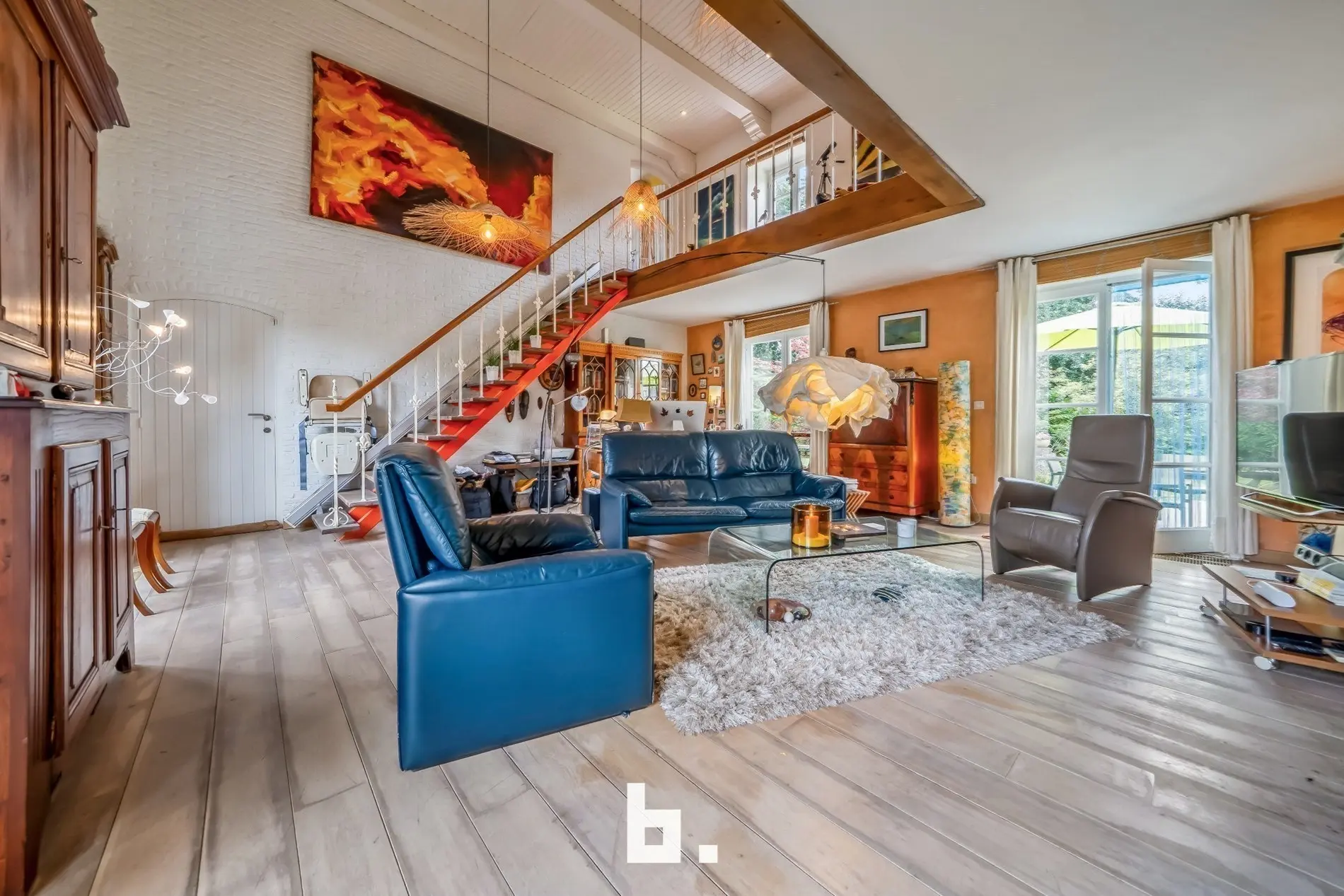 Een lange oprit leidt u naar deze bijzondere woning. Via de uitnodigende entree betreedt u een ruime, sfeervolle woonkamer met open traphal. Grote raampartijen laten het daglicht overvloedig binnen en bieden een prachtig uitzicht op de zonnige, verzorgde tuin. Aansluitend bevindt zich een lichtrijke eetkamer, perfect voor lange, gezellige diners, naast een royale aparte keuken die uitnodigt tot culinair genieten. Aan de inkom zijn bovendien een aparte technische ruimte en een gastentoilet voorzien.