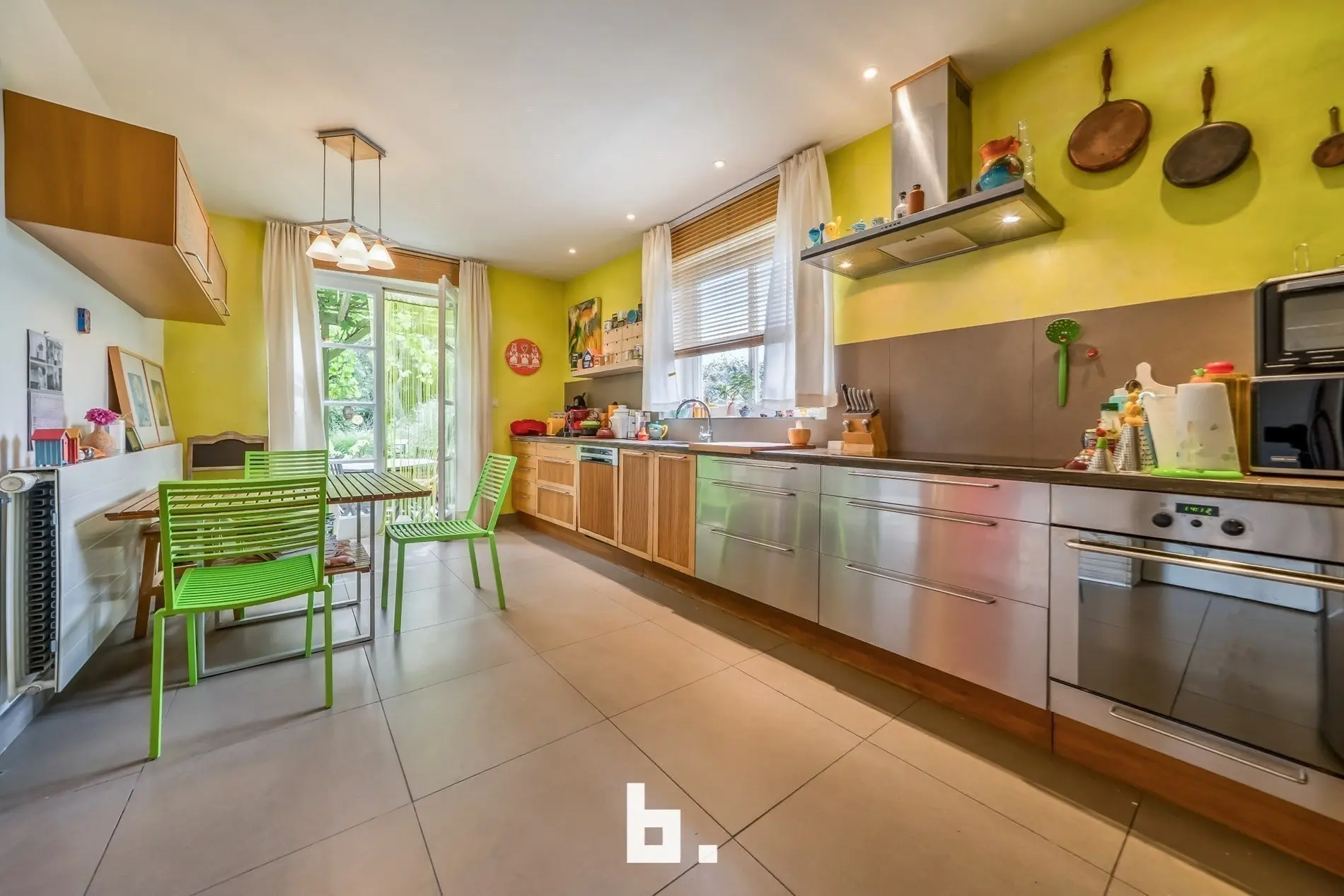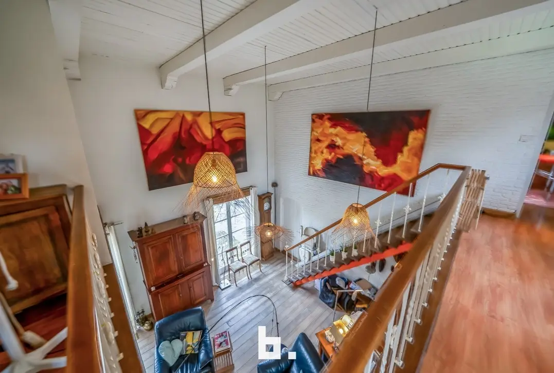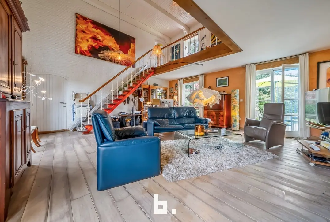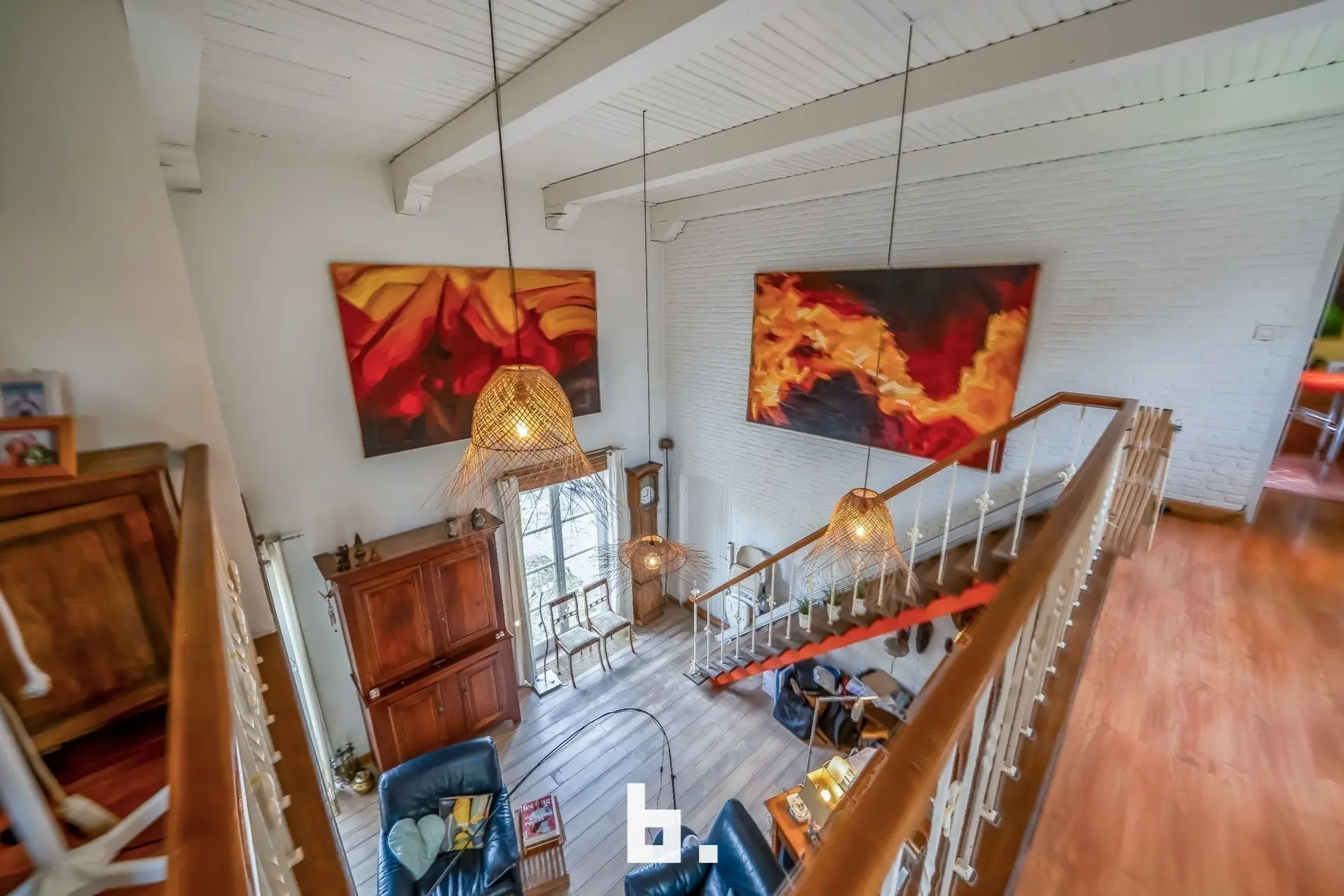 Een lange oprit leidt u naar deze bijzondere woning. Via de uitnodigende entree betreedt u een ruime, sfeervolle woonkamer met open traphal. Grote raampartijen laten het daglicht overvloedig binnen en bieden een prachtig uitzicht op de zonnige, verzorgde tuin. Aansluitend bevindt zich een lichtrijke eetkamer, perfect voor lange, gezellige diners, naast een royale aparte keuken die uitnodigt tot culinair genieten. Aan de inkom zijn bovendien een aparte technische ruimte en een gastentoilet voorzien.