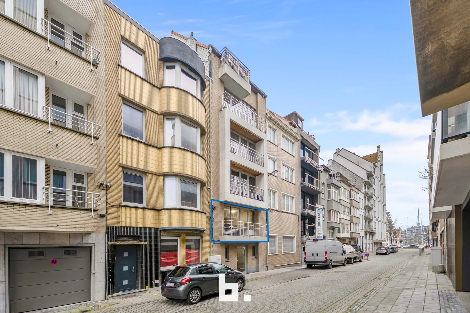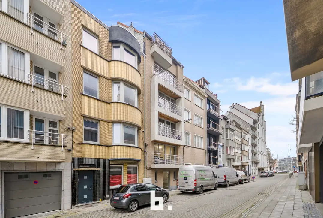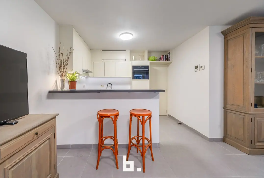 Op het eerste verdiep bevindt zich een mooi en lichtrijk appartement met een ruime living en open keuken, een klein terras aan de straatzijde, een aparte berging, een apart toilet en een slaapkamer met aansluitend open badkamer uitgerust met bad en douche. Achteraan is er bovendien een nog in te richten binnen terras.
