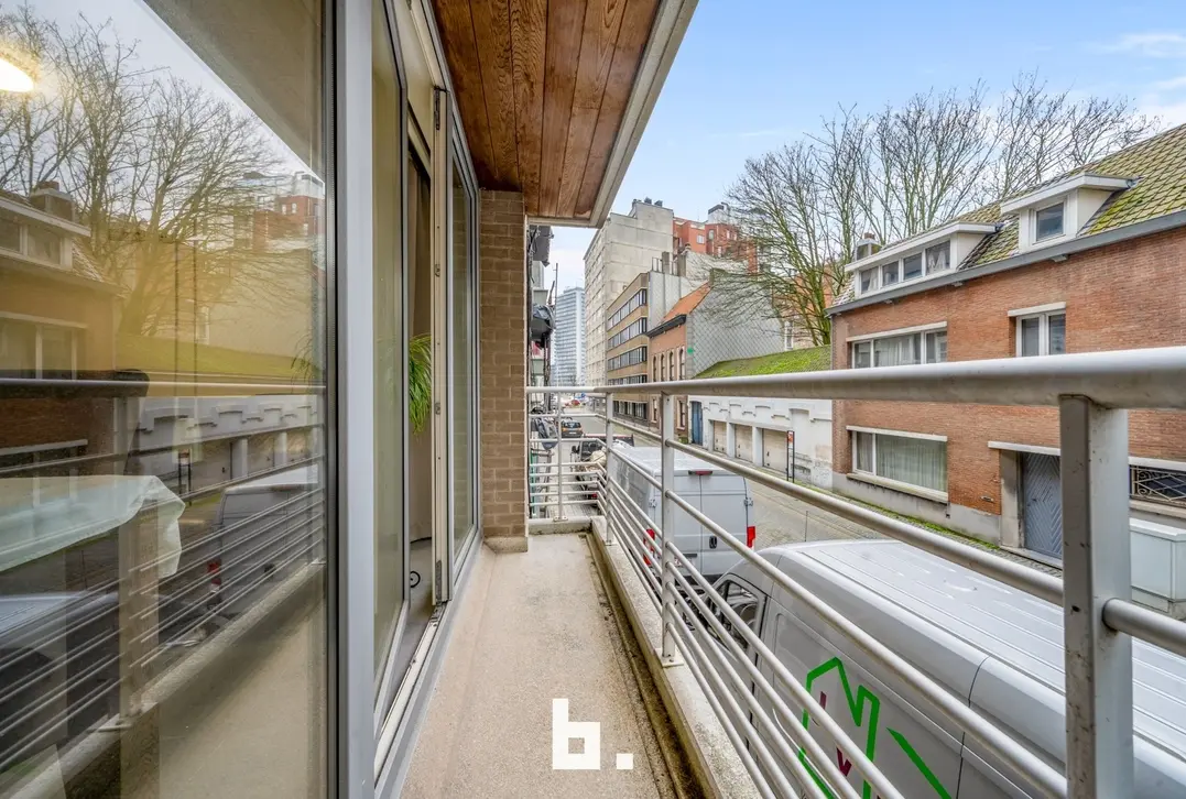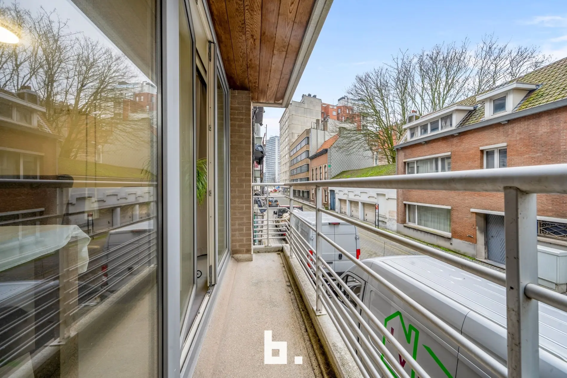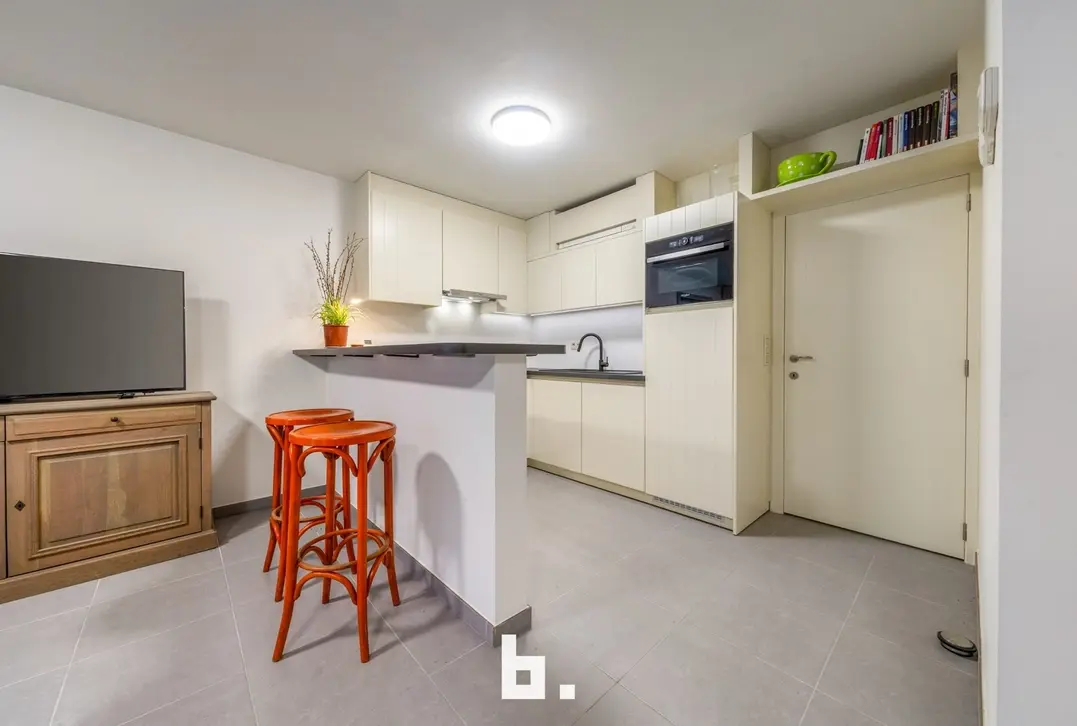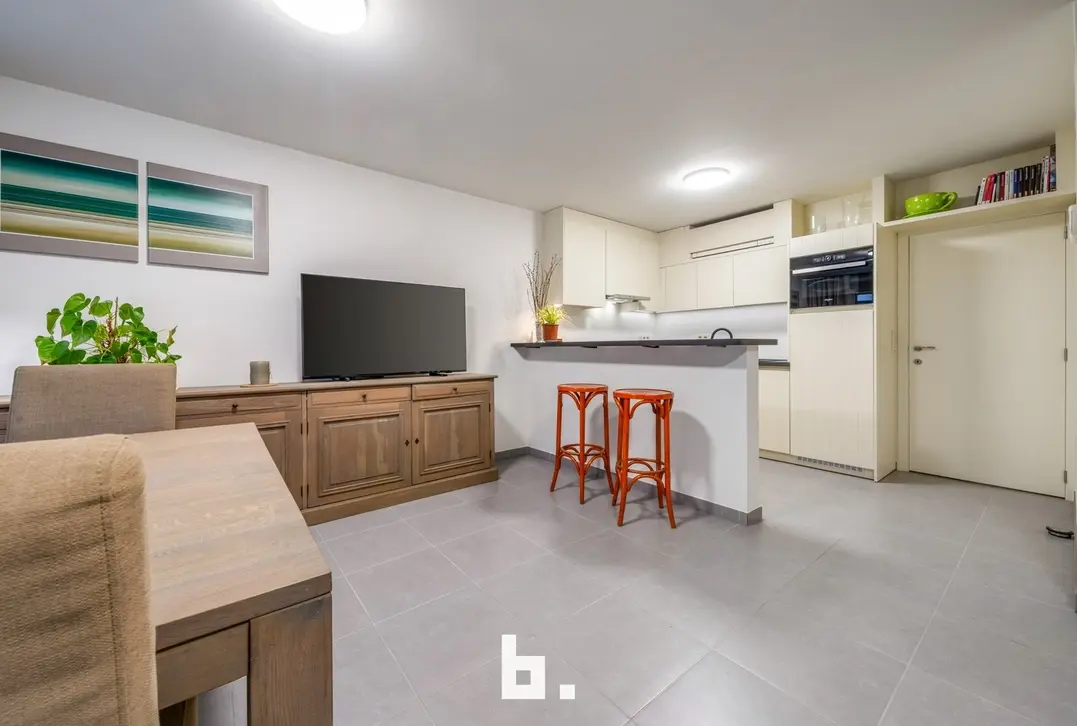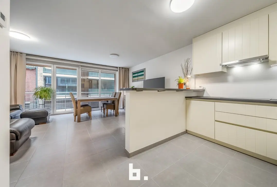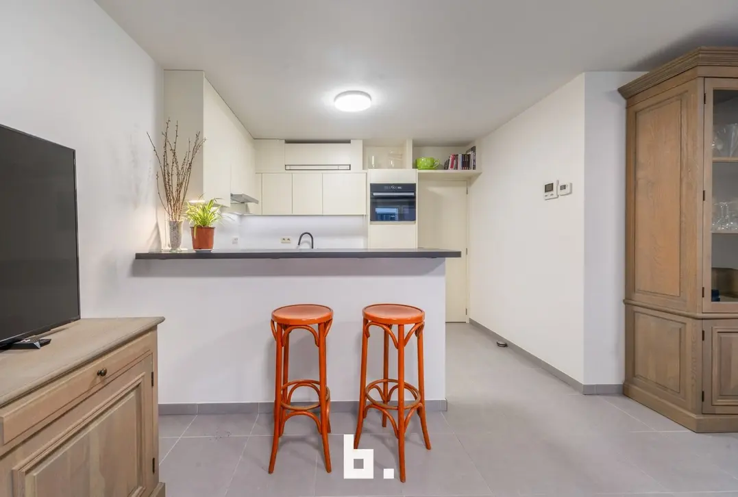 Op het eerste verdiep bevindt zich een mooi en lichtrijk appartement met een ruime living en open keuken, een klein terras aan de straatzijde, een aparte berging, een apart toilet en een slaapkamer met aansluitend open badkamer uitgerust met bad en inloopdouche. Achteraan is er bovendien een nog in te richten binnen terras.