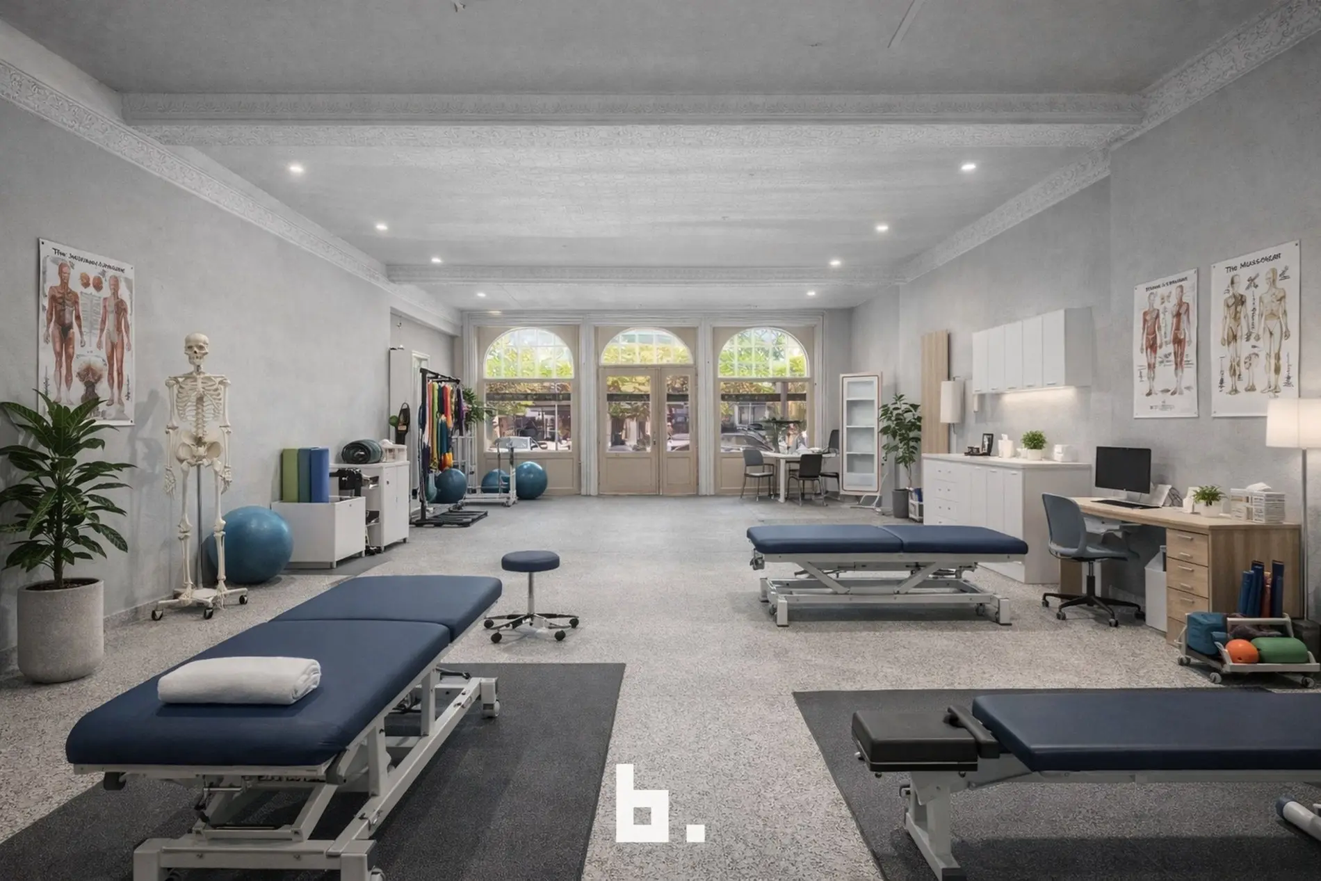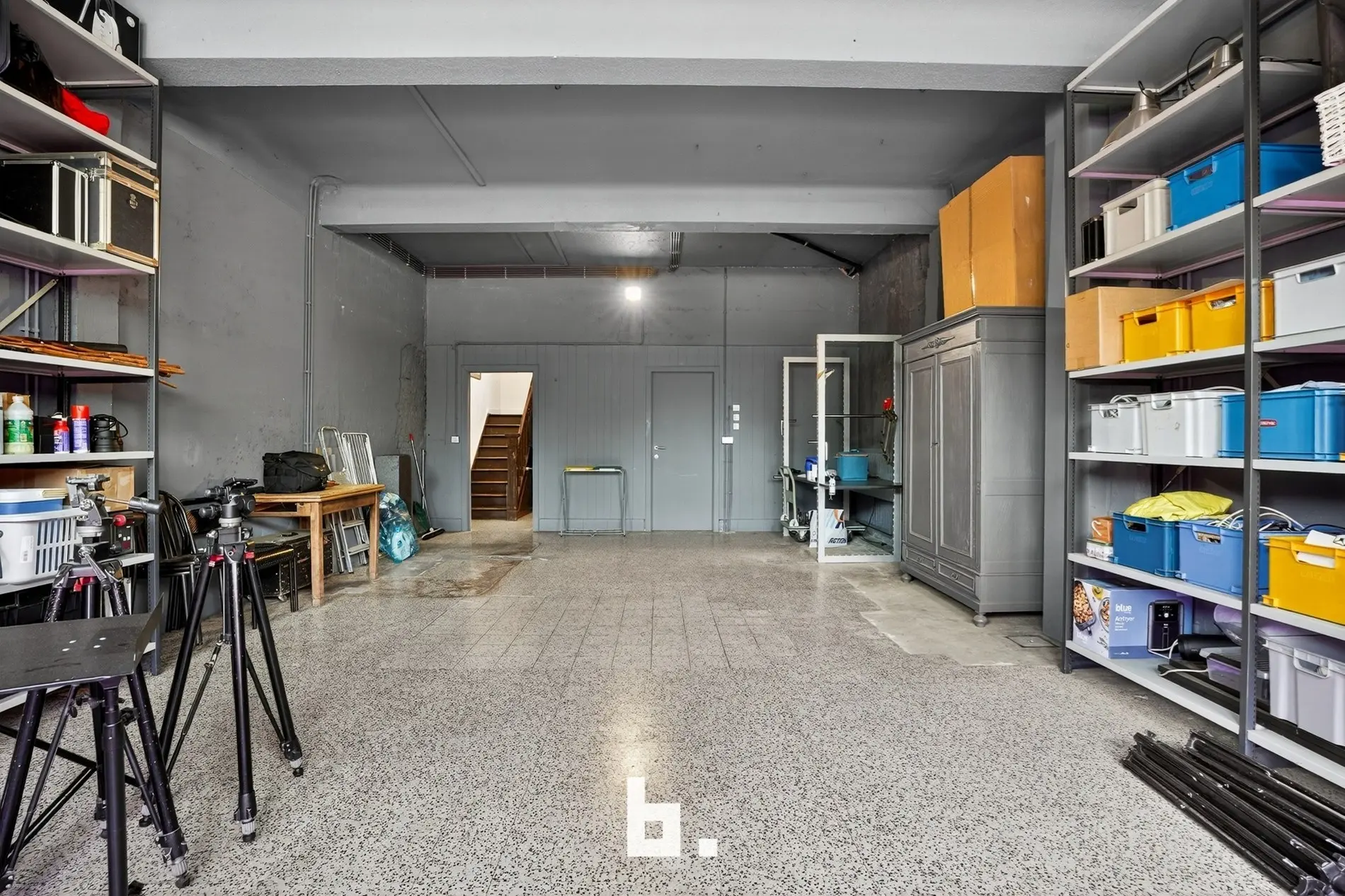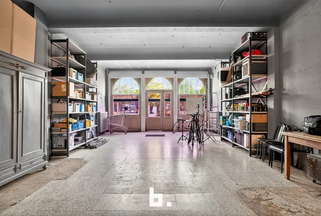 Op het gelijkvloers bevindt zich momenteel een stijlvolle fotostudio met kitchenette en sanitaire voorzieningen.