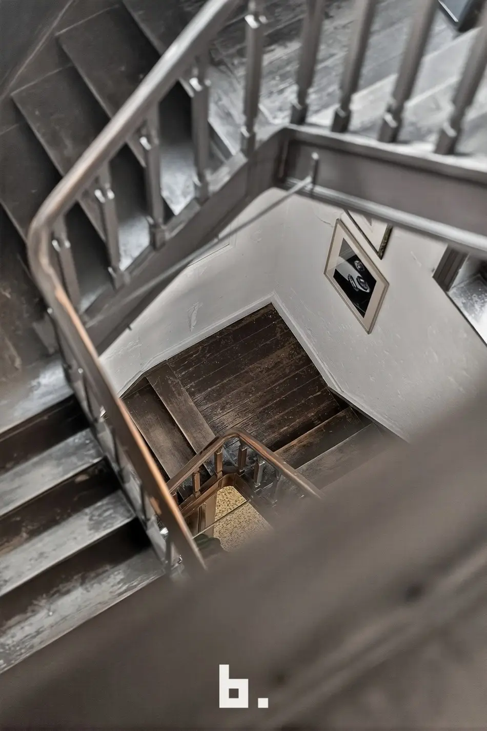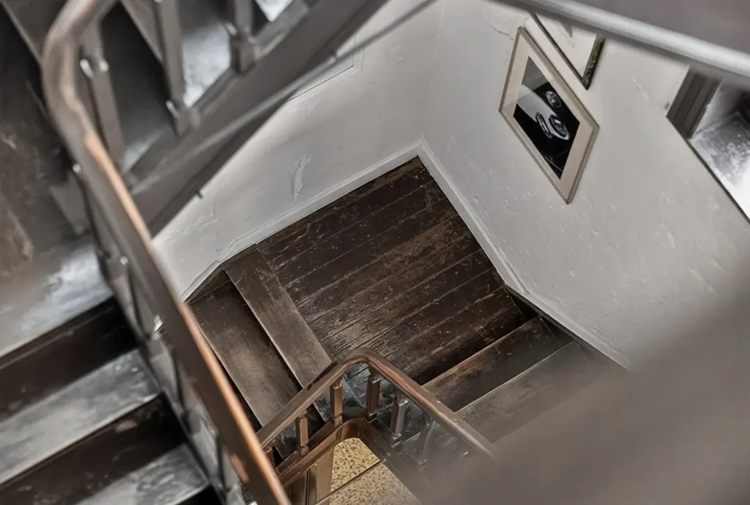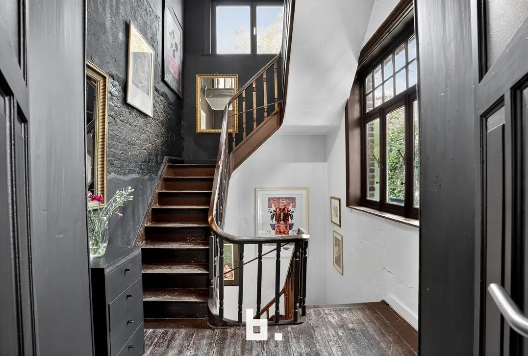De imposante traphal leidt naar de eerste verdieping, waar een warme leefruimte zich ontvouwt over authentieke parketvloeren.