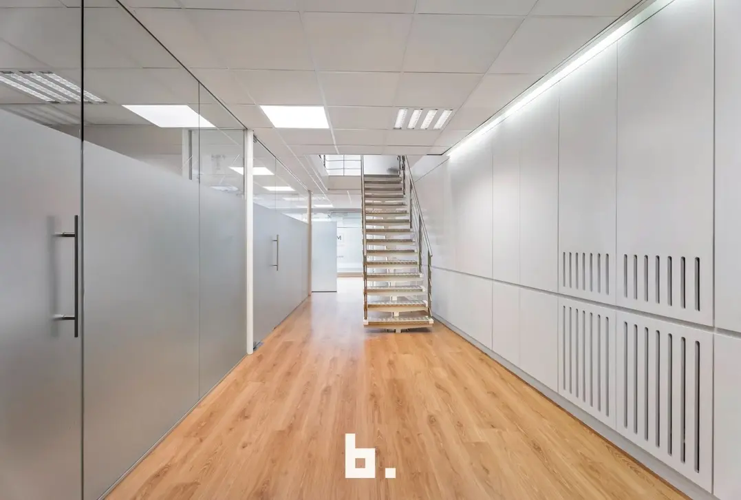 Dankzij de grote raampartijen geniet deze kantoorruimte van een moderne uitstraling en veel lichtinval, wat bijdraagt aan een productieve en aangename werksfeer.