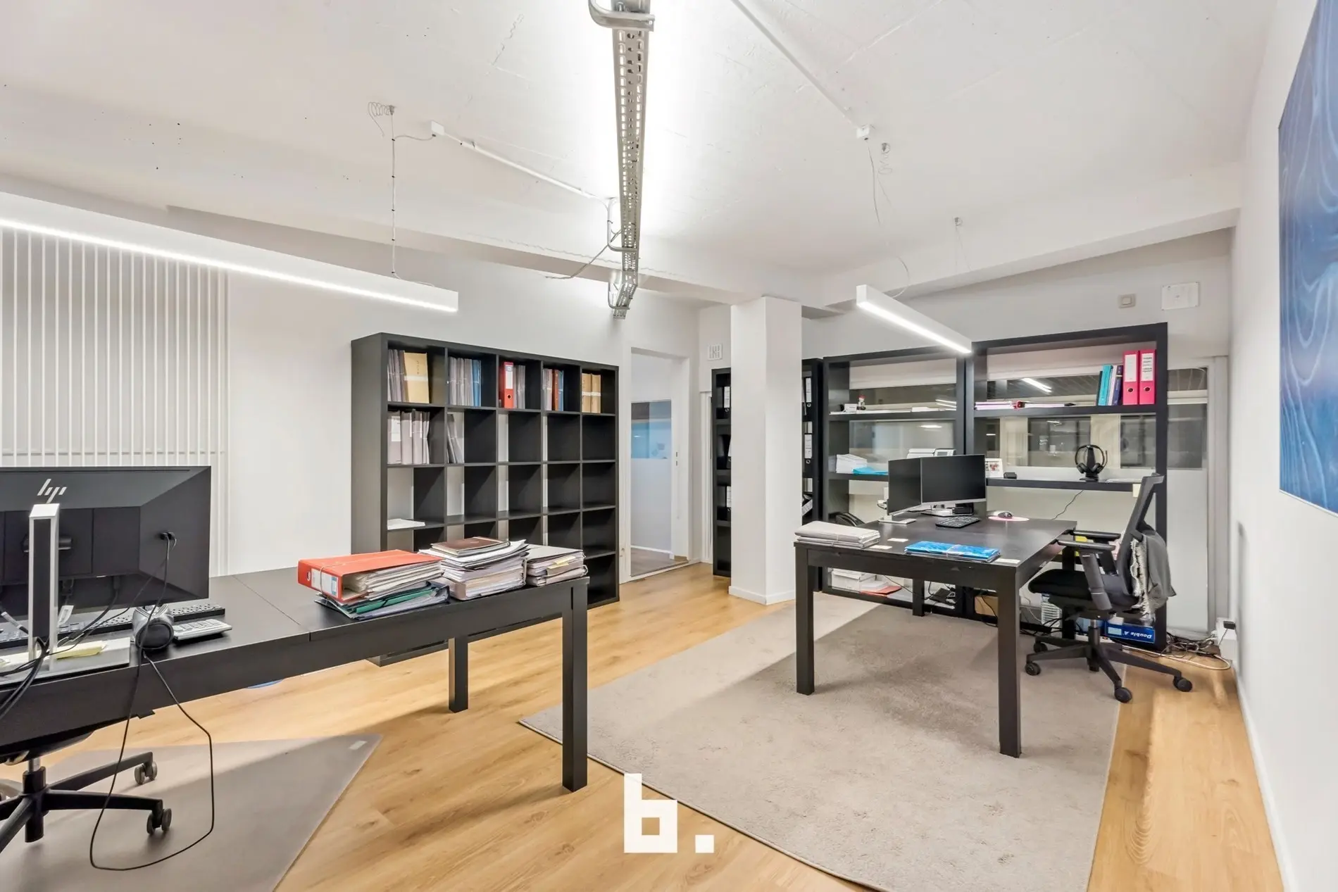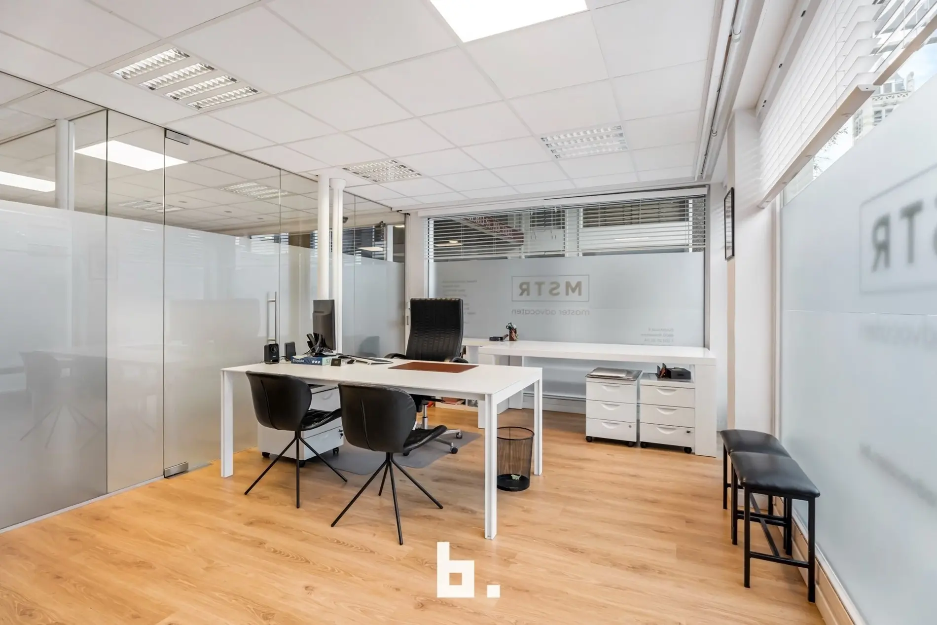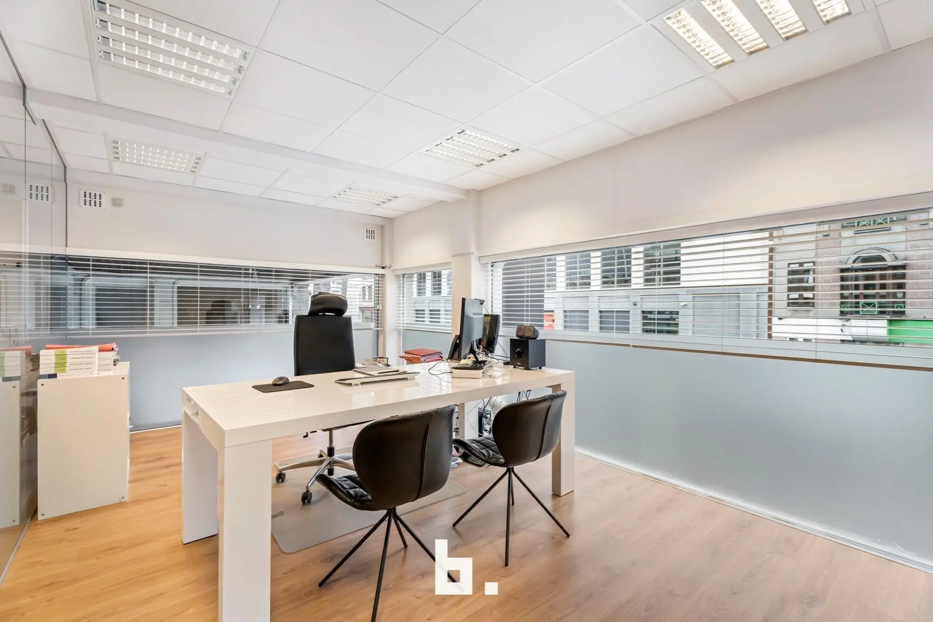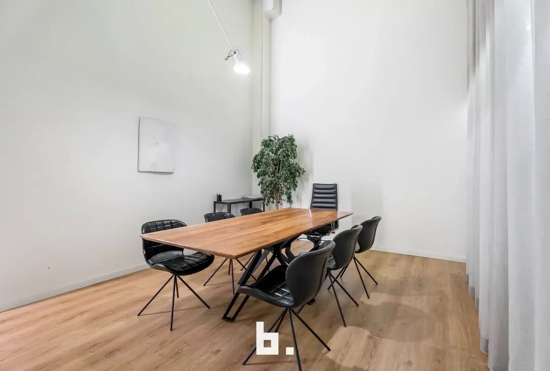 Dankzij de grote raampartijen geniet deze kantoorruimte van een moderne uitstraling en veel lichtinval, wat bijdraagt aan een productieve en aangename werksfeer.