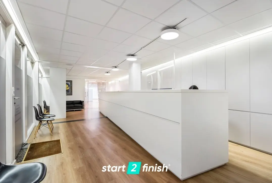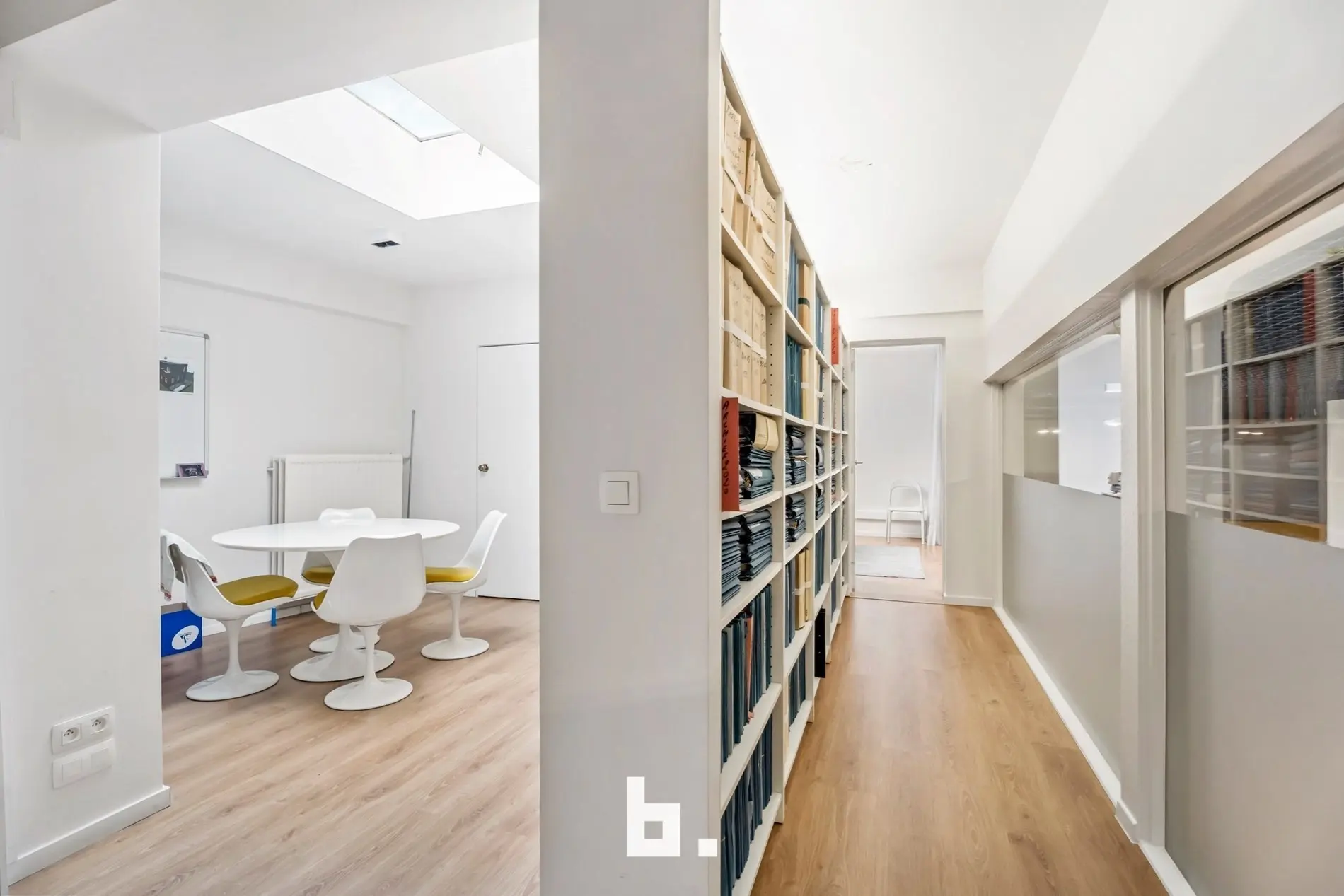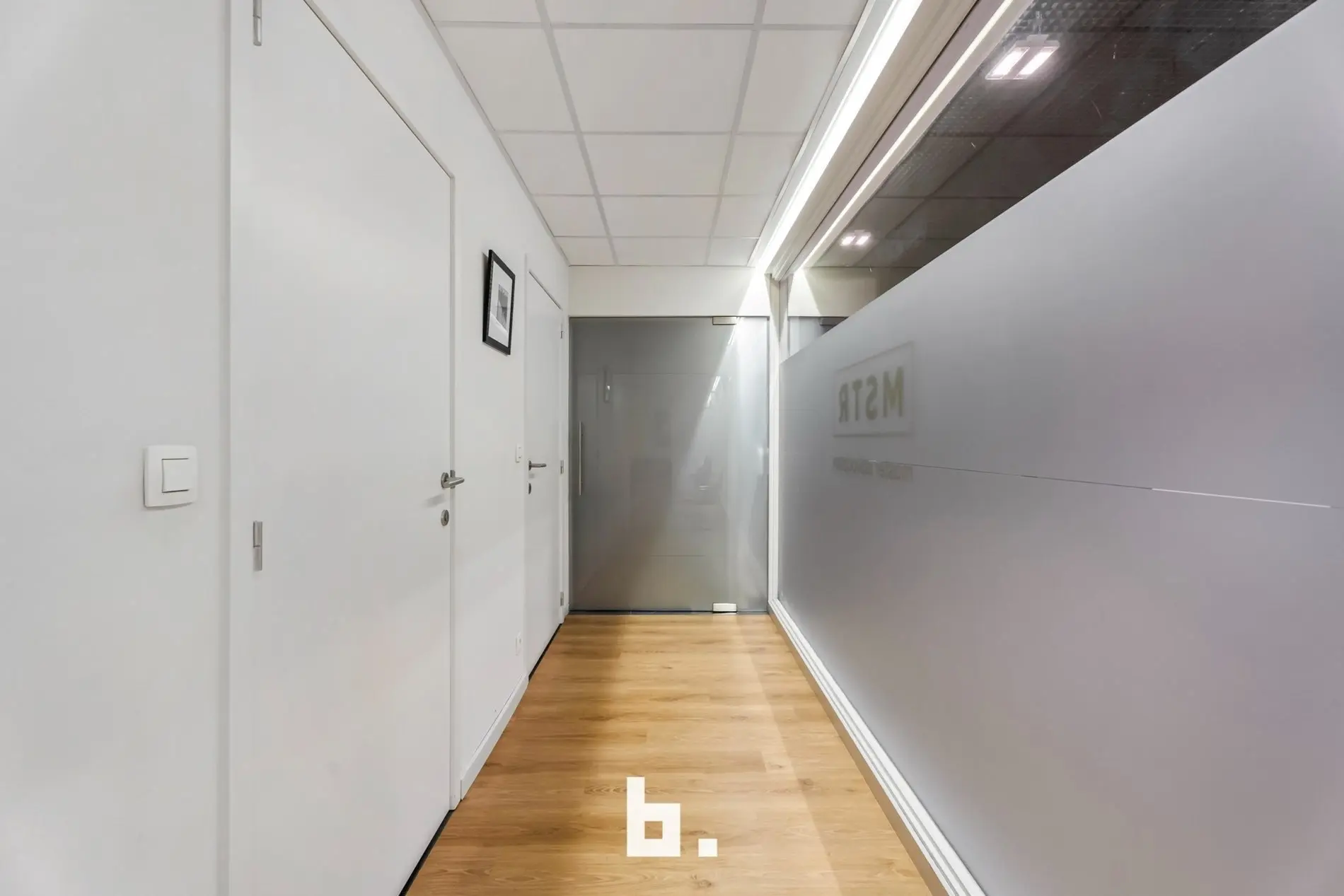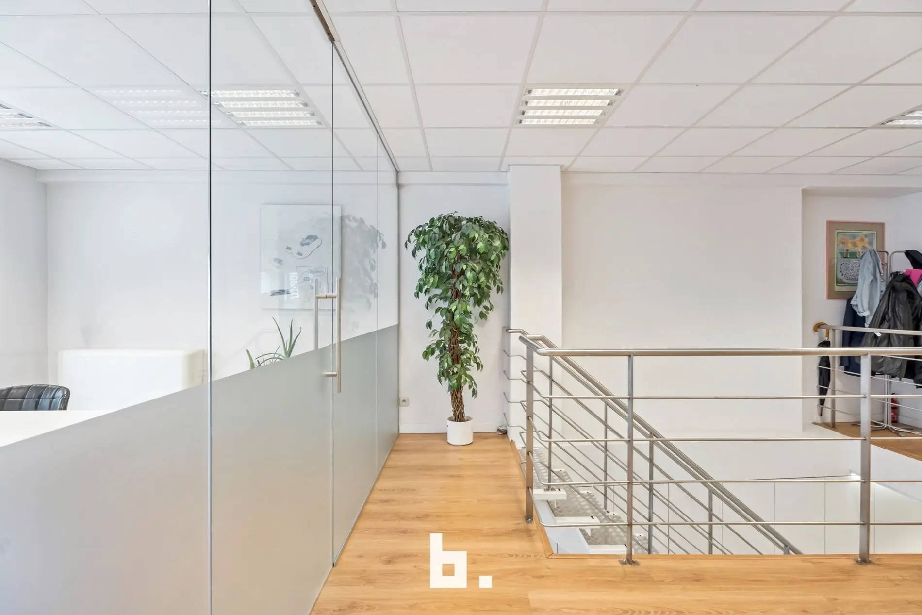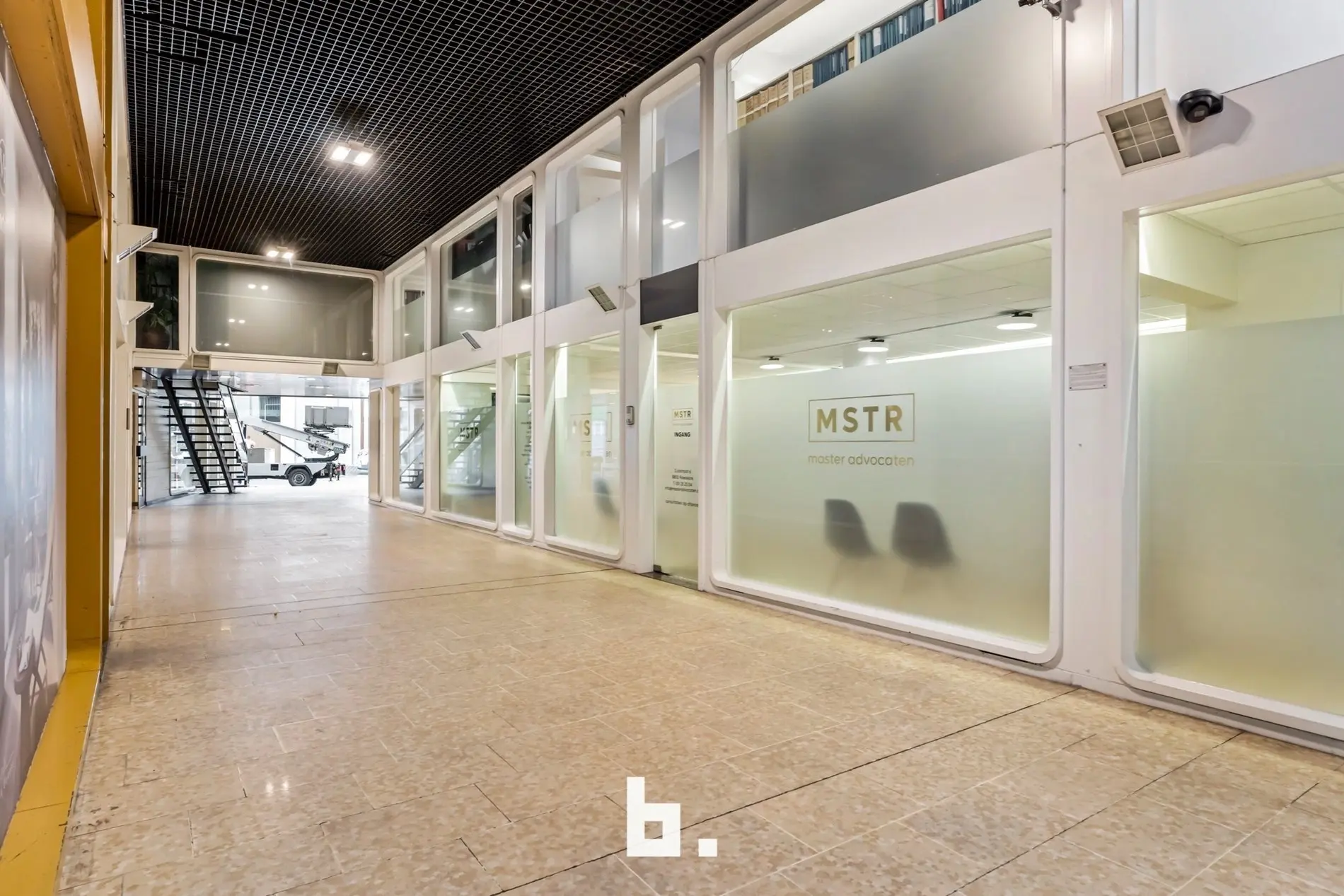 Dankzij de grote raampartijen geniet deze kantoorruimte van een moderne uitstraling en veel lichtinval, wat bijdraagt aan een productieve en aangename werksfeer.