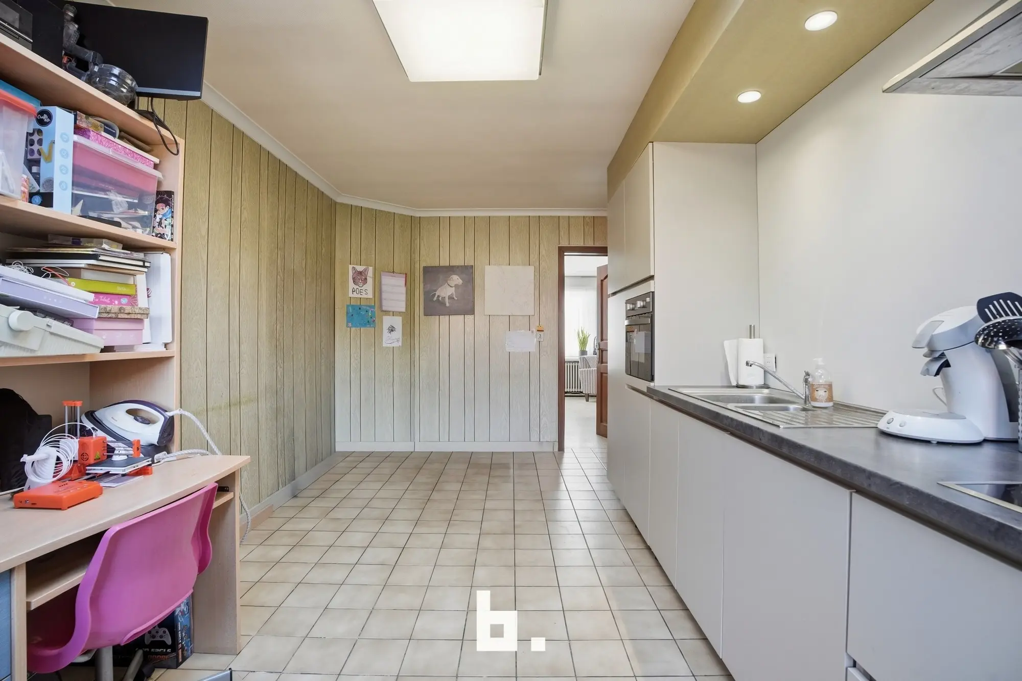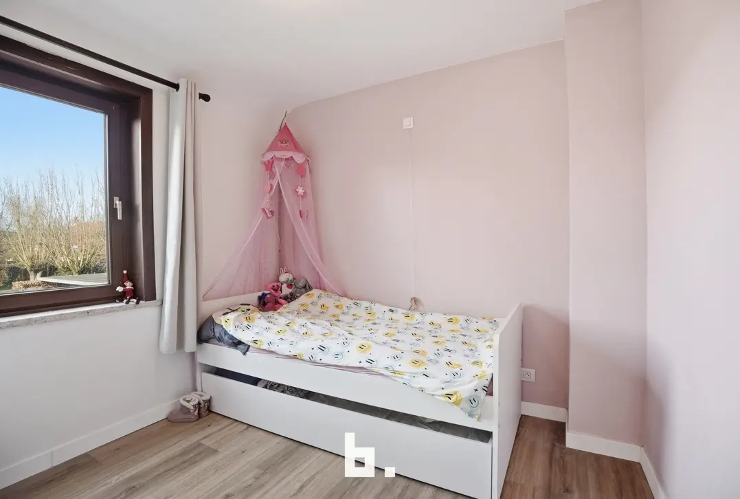 Bij het betreden van de woning kom je in de inkomhal die toegang geeft tot de lichtrijke leefruimte, bestaande uit een gezellige eetplaats en salon. De keuken werd vorig jaar volledig vernieuwd en is modern en functioneel ingericht. Verder beschikt het gelijkvloers over een grote inpandige garage met sectionale poort en een praktische droge kelder.
