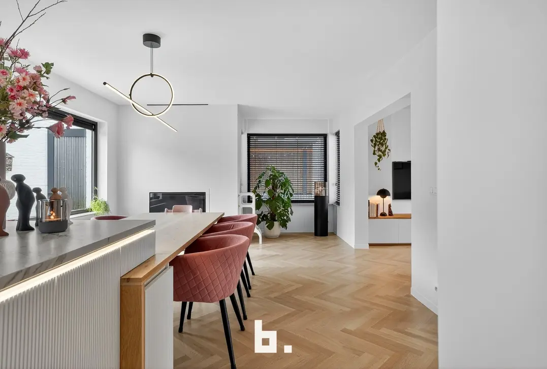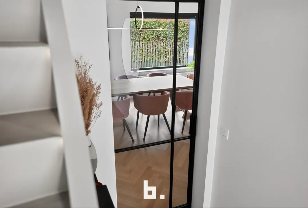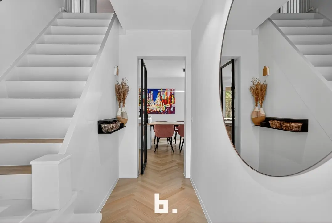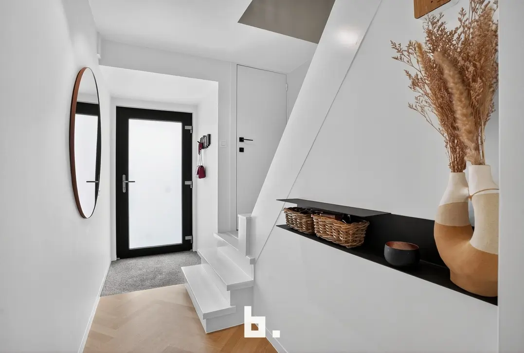 Bij het binnenkomen word je meteen verwelkomd door een stijlvolle inkomhal met open trap en een moderne staalijzeren deur die de toon zet voor de rest van de woning. De visgraatparket loopt naadloos door en zorgt voor een warme, luxueuze uitstraling.