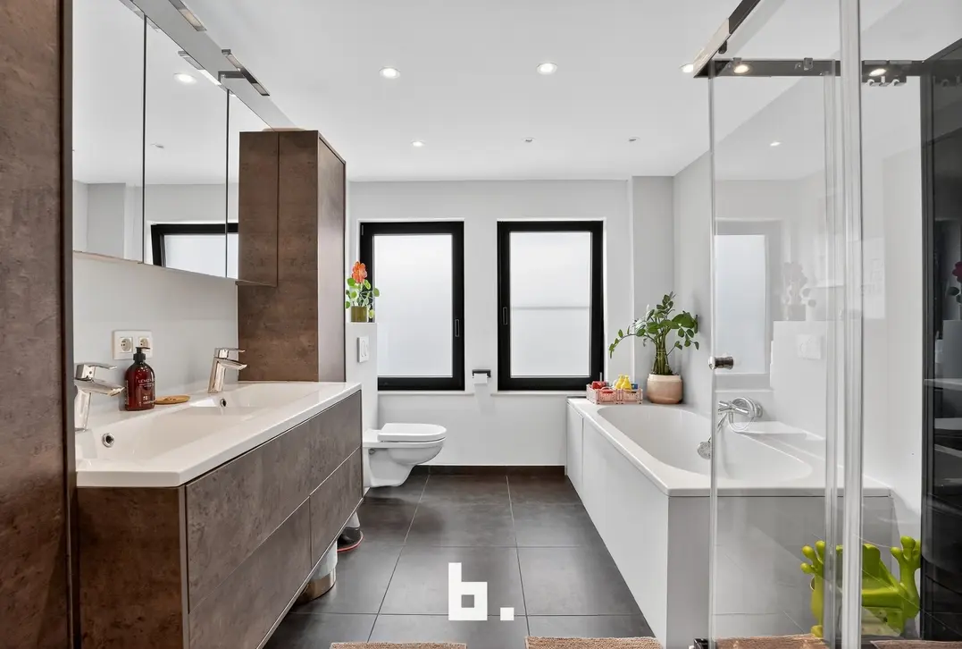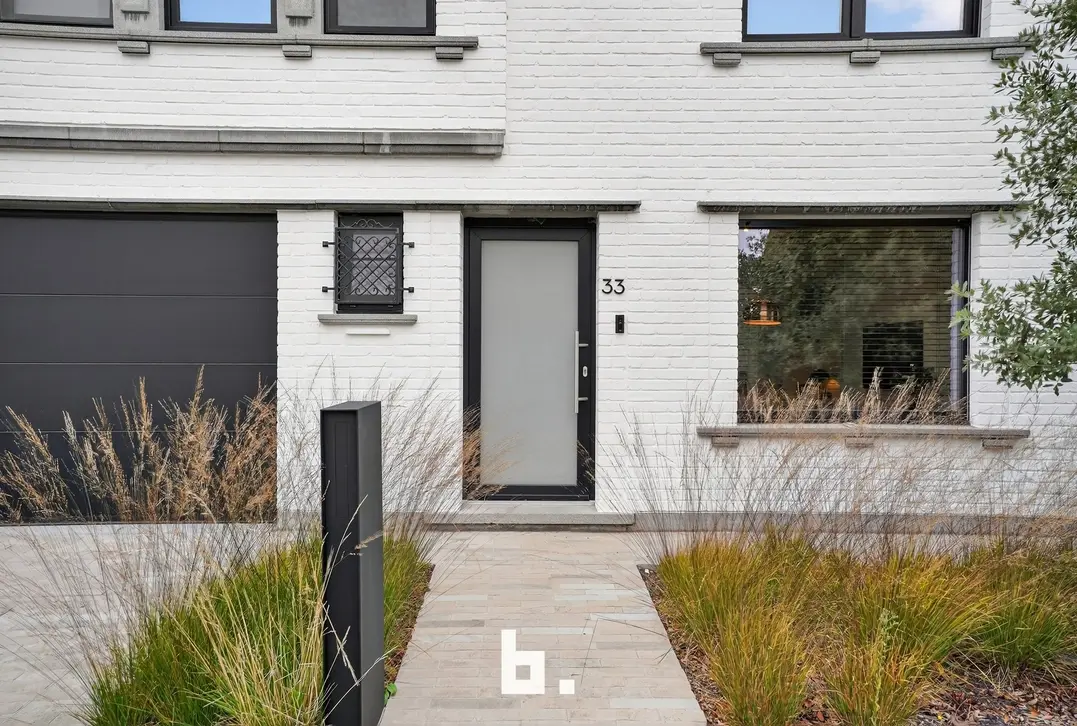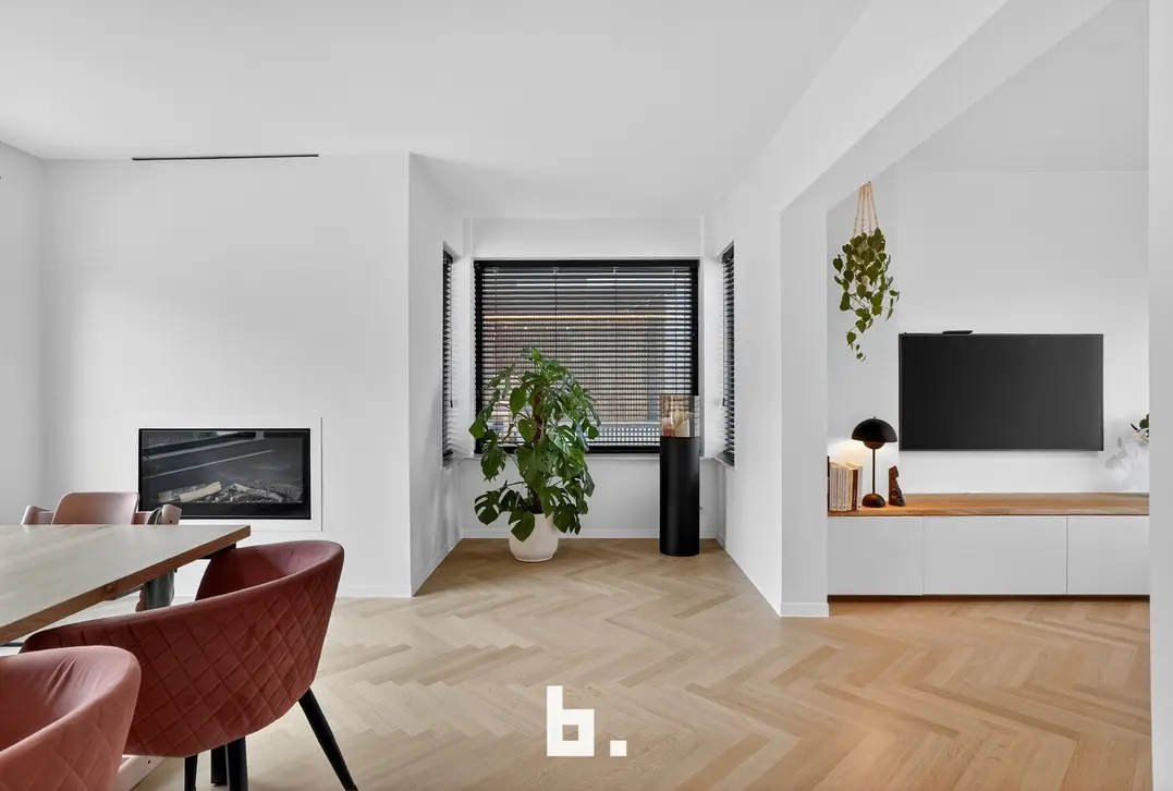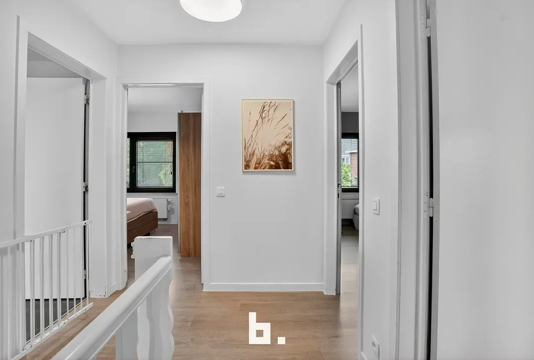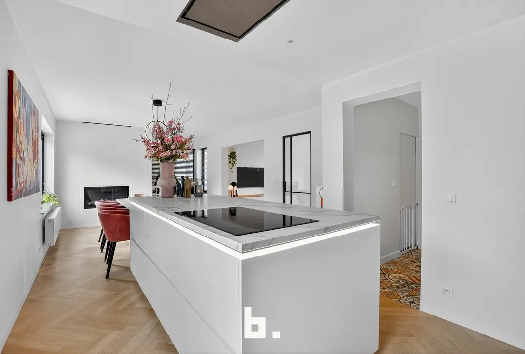 Bij het binnenkomen word je meteen verwelkomd door een stijlvolle inkomhal met open trap en een moderne staalijzeren deur die de toon zet voor de rest van de woning. De visgraatparket loopt naadloos door en zorgt voor een warme, luxueuze uitstraling.