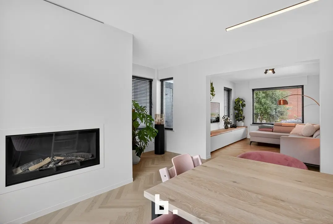 De lichtrijke leefruimte nodigt uit tot rust en ontspanning. De gezellige zithoek met gashaard vormt het hart van het huis – een perfecte plek om te genieten met familie en vrienden.