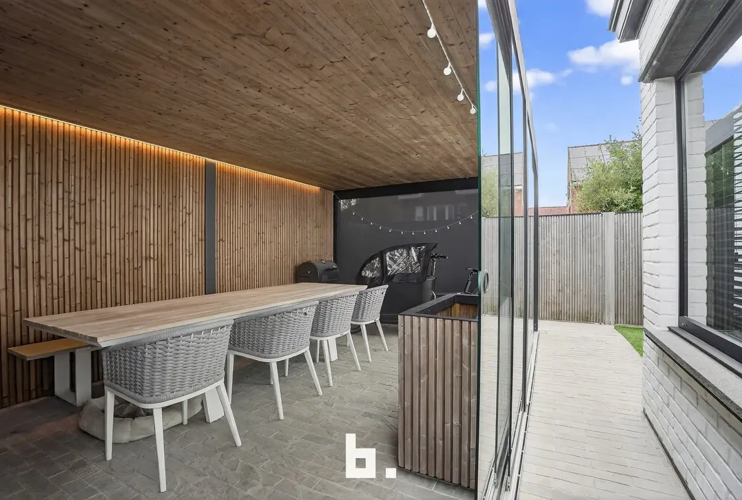 Via de grote raampartijen kijk je uit op de verzorgde, volledig omheinde tuin. Het overdekte terras vormt de ideale plek om te ontspannen, ongeacht het weer. Aansluitend bevindt zich een tuinberging, ideaal voor fietsen of tuingerief. Onder het terras is er bovendien mogelijkheid tot overdekt parkeren, met een automatische poort die zorgt voor volledige privacy.