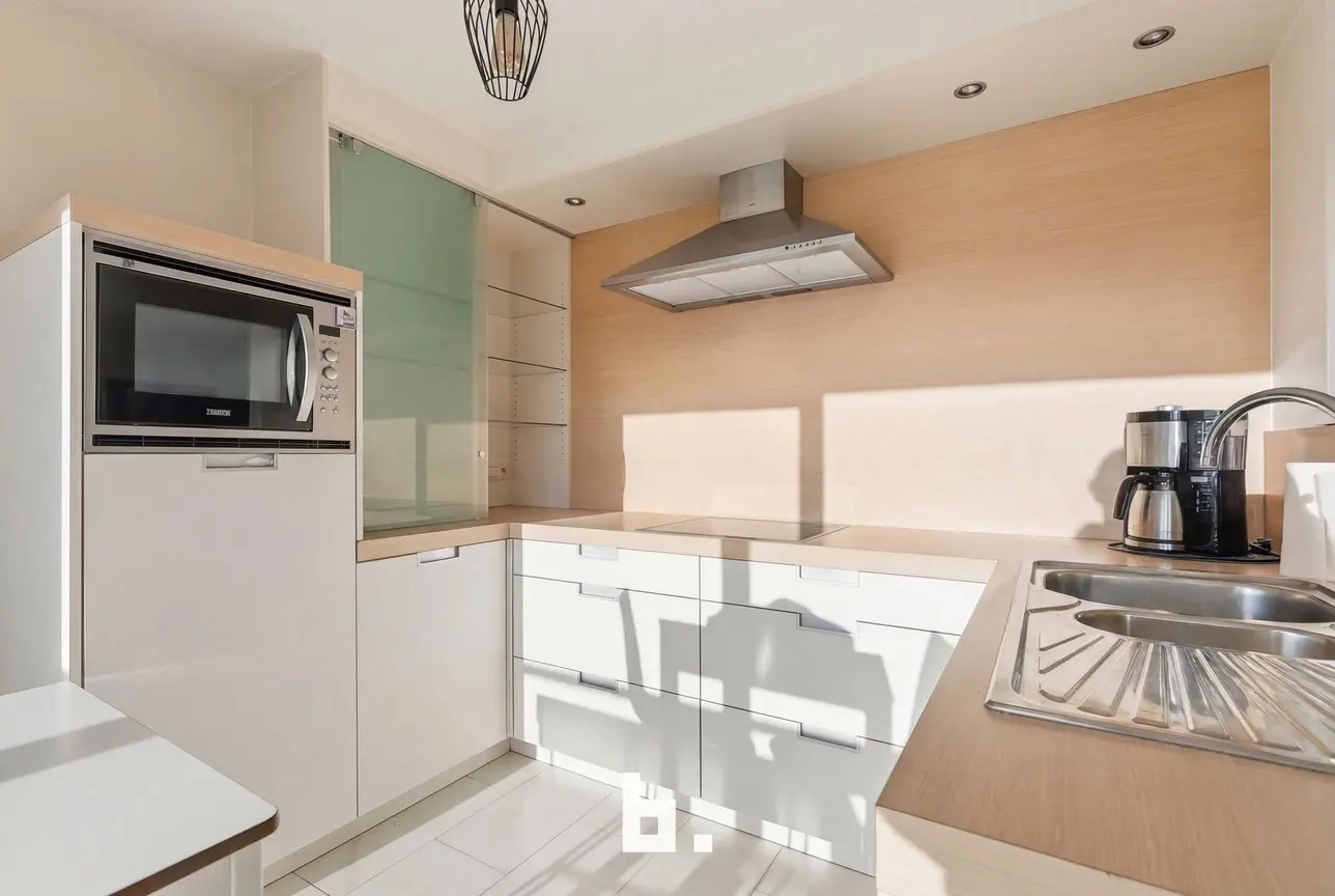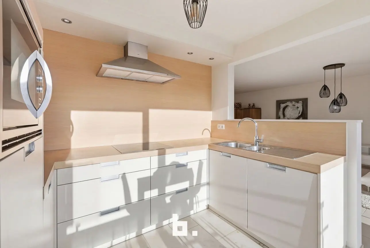 De royale leefruimte met open keuken baadt in het licht dankzij grote raampartijen en biedt een prachtige connectie met het terras aan de voorzijde. Hier geniet u dagelijks van een open en weids zicht over de stad. De keuken sluit naadloos aan op de leefruimte en wordt aangevuld met een praktische berging.