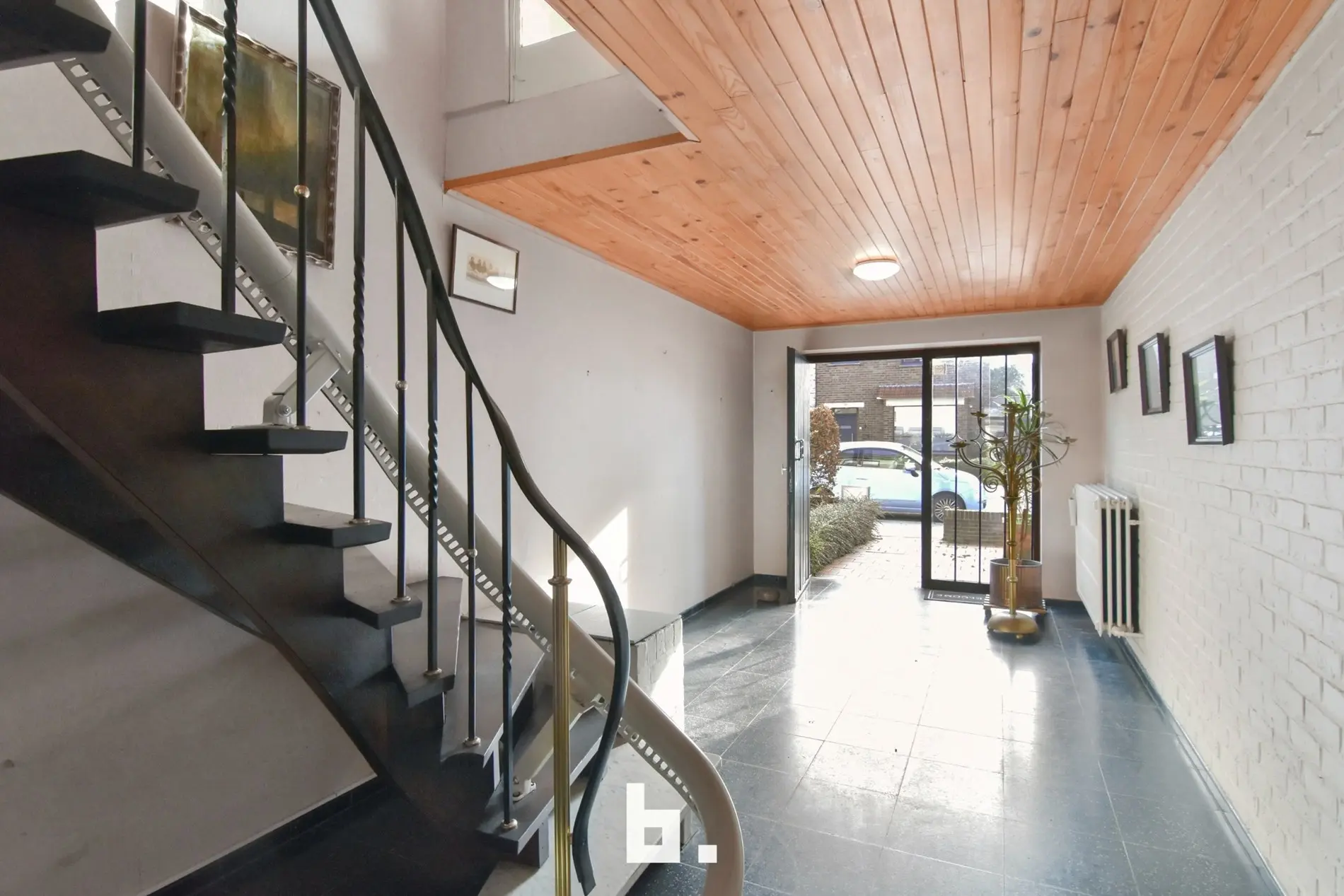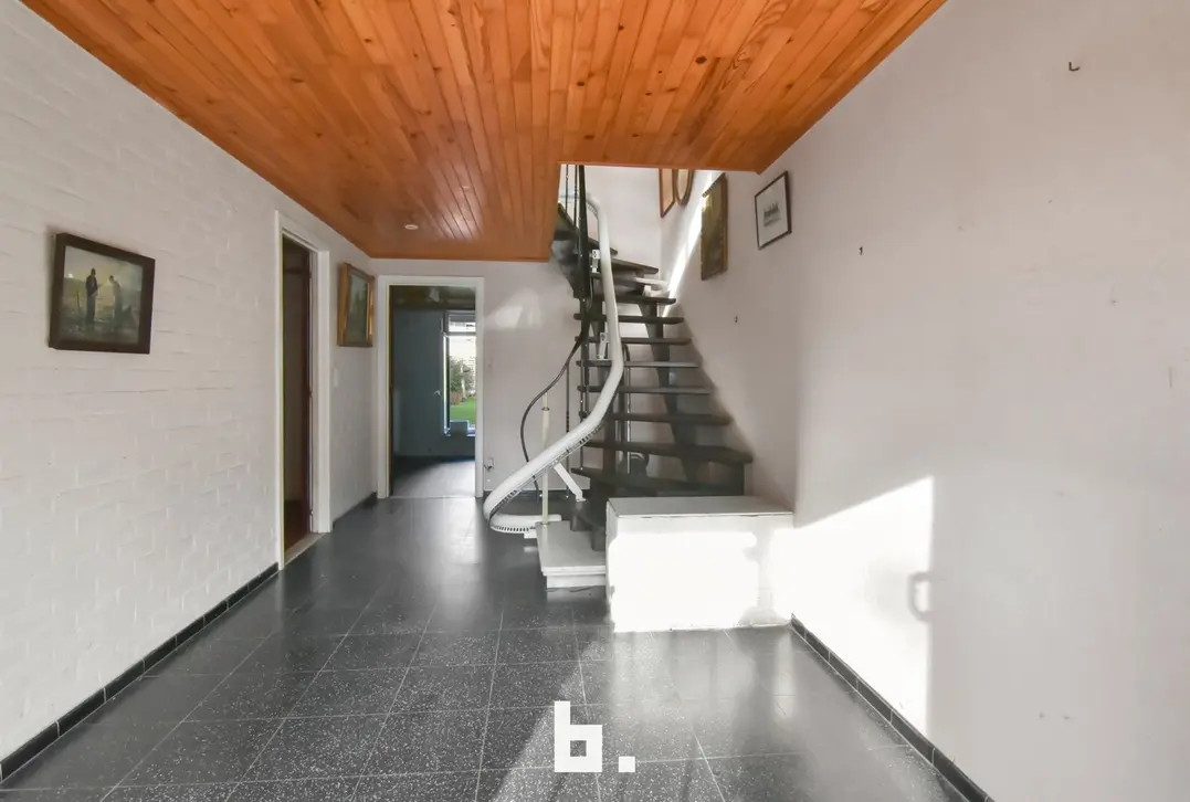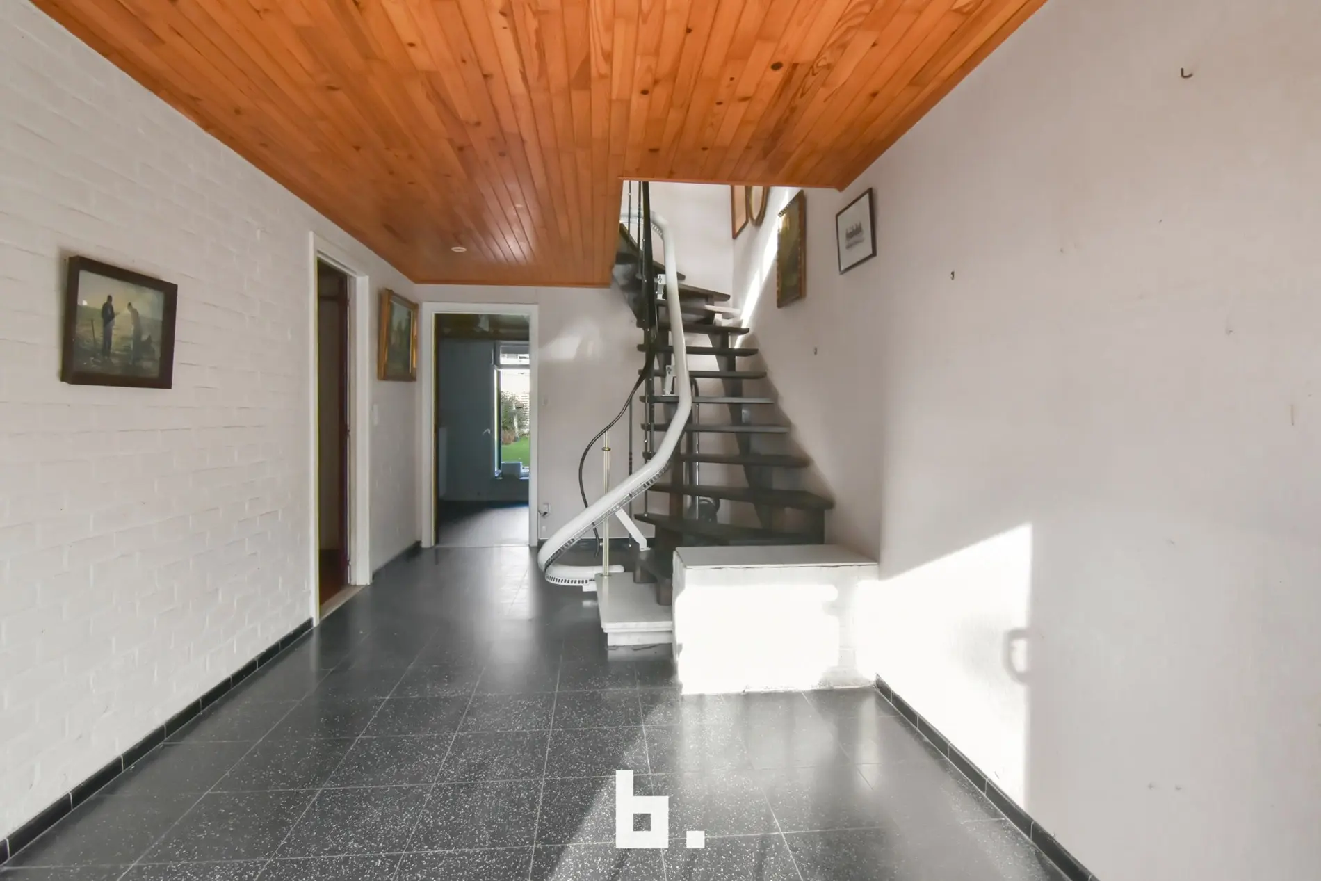 Deze woning beschikt op het gelijkvloers over een inkomhal met toegang tot de garage met oprit, twee praktische bergingsruimtes en een ruime, zonnige tuin.