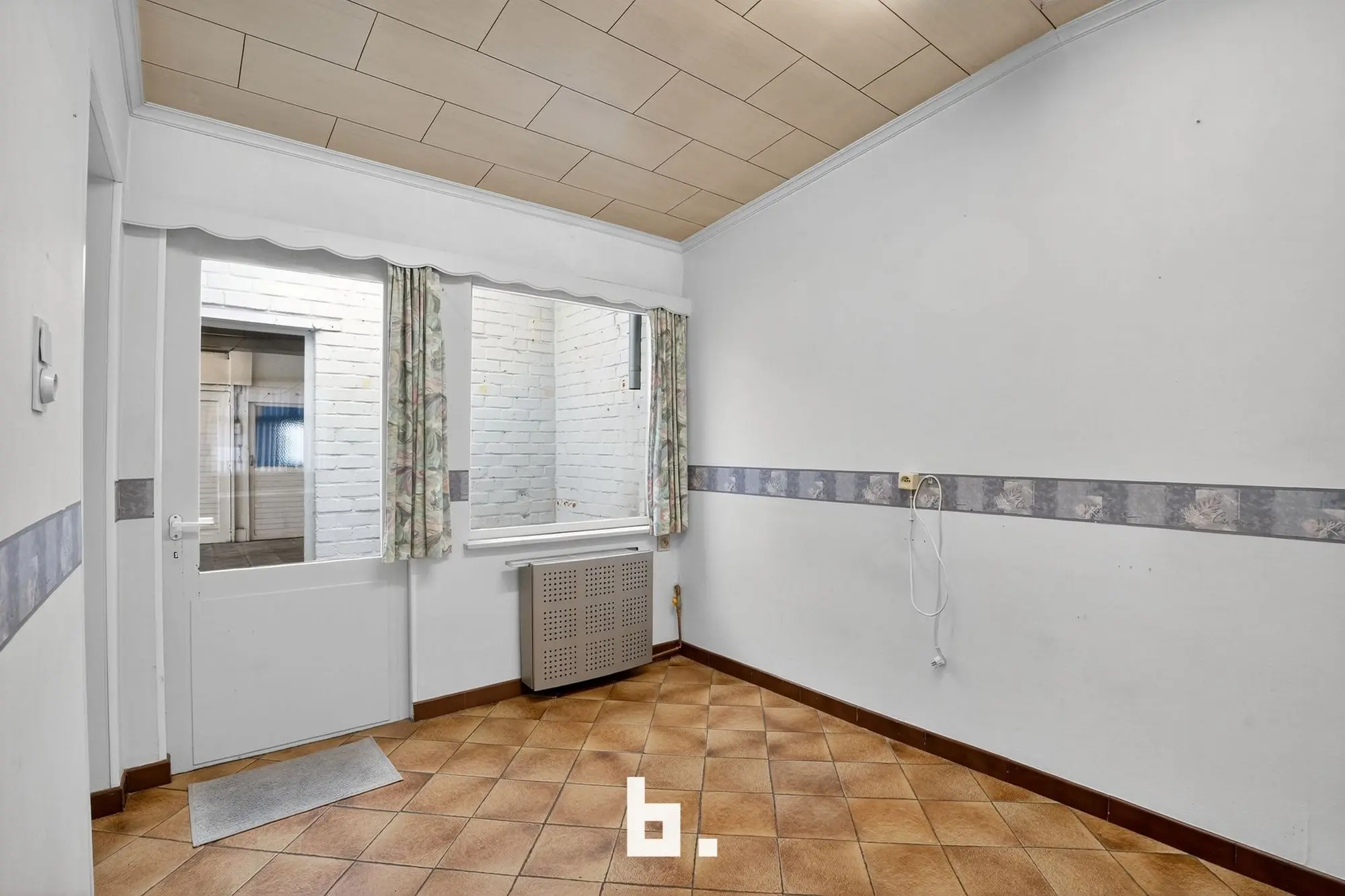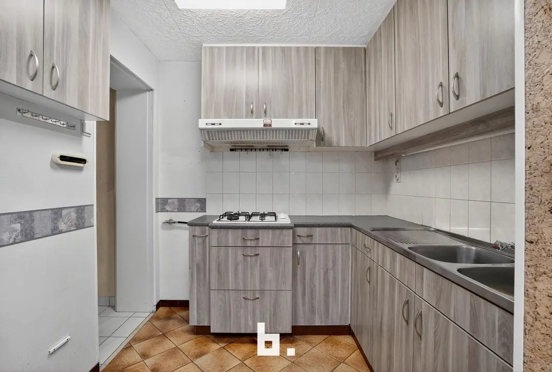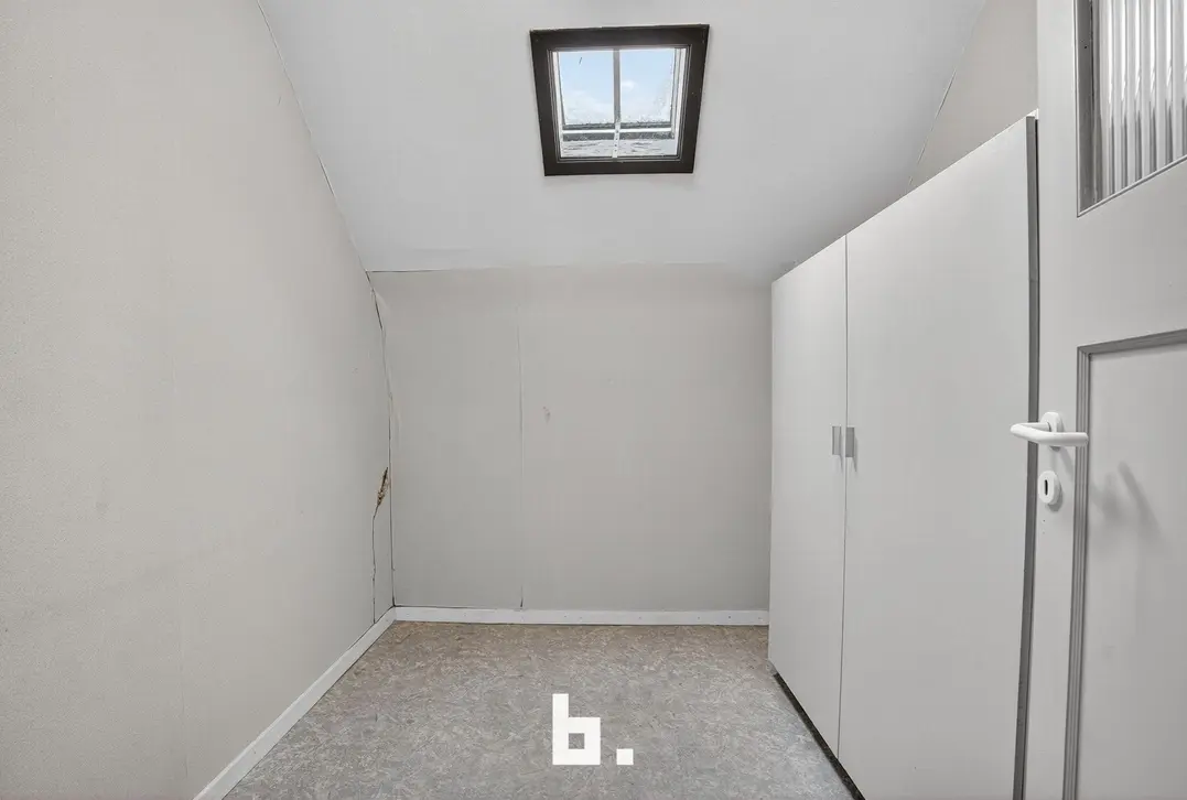 Indeling: inkom met trap, eet- en leefruimte, keuken, badkamer met toilet en inloopdouche, ruime overdekte koer met aansluitingen voor was- en droogkast.