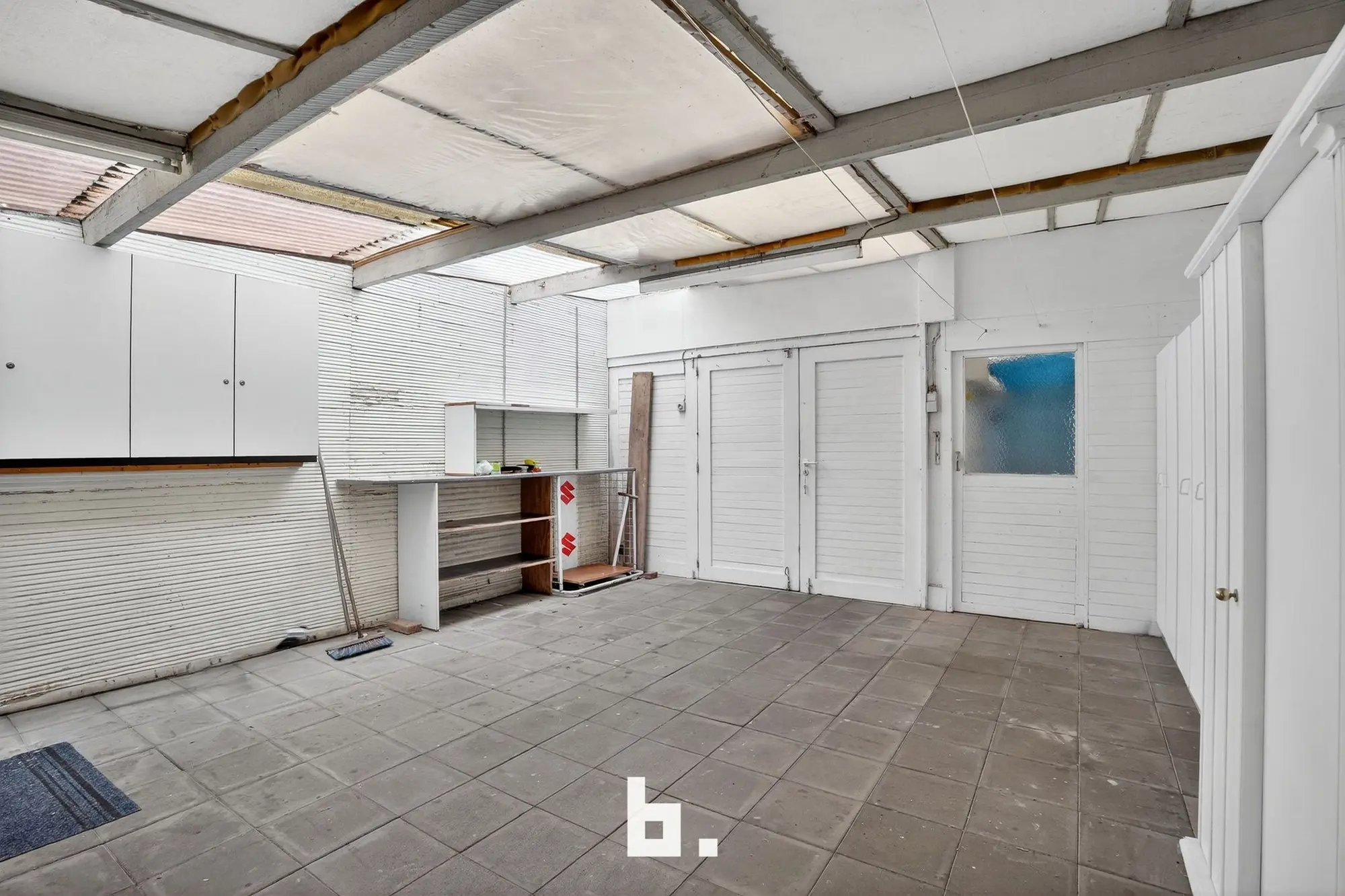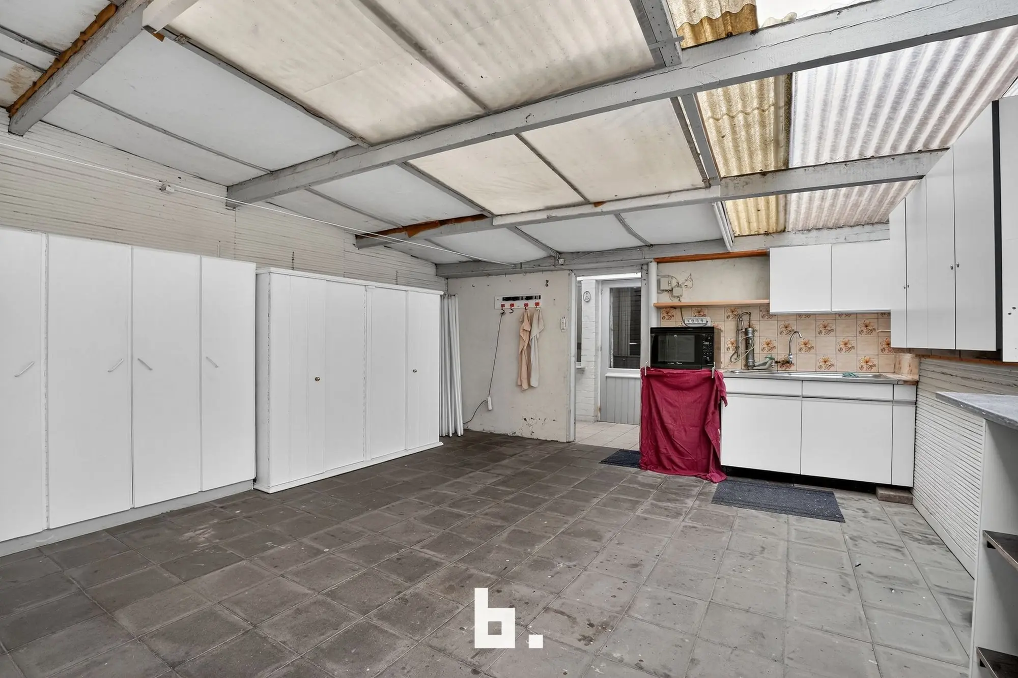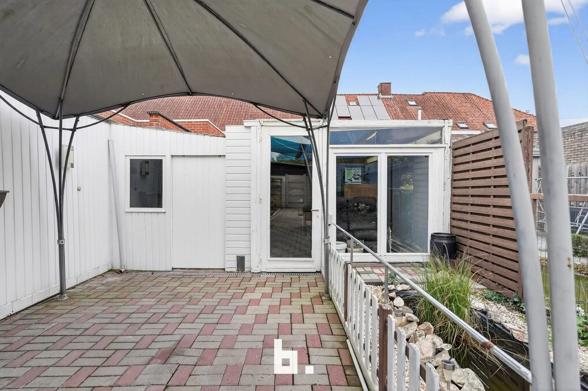 Indeling: inkom met trap, eet- en leefruimte, keuken, badkamer met toilet en inloopdouche, ruime overdekte koer met aansluitingen voor was- en droogkast.
