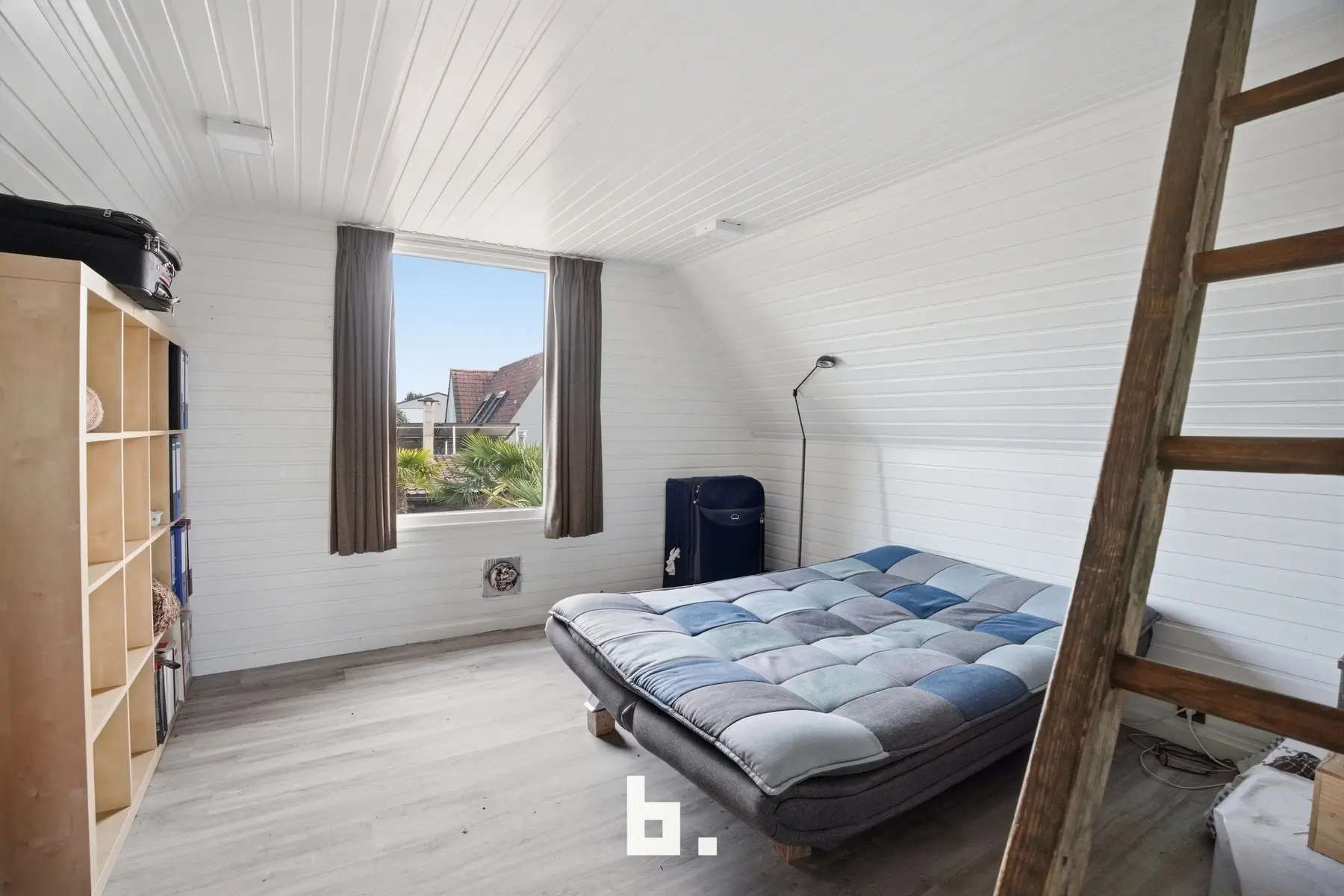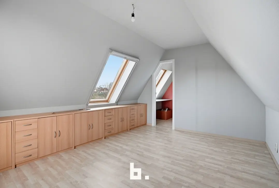 De woning kom je binnen via de inkom met gastentoilet, verder heb je de leefruimte met trap naar het eerste verdiep. Aansluitend de keuken met eetplaats en zicht op de tuin. Naast de keuken heb je de inpandige garage met alle technieken en automatische poort. Douchekamer. Op het eerste verdiep zijn de twee slaapkamers.