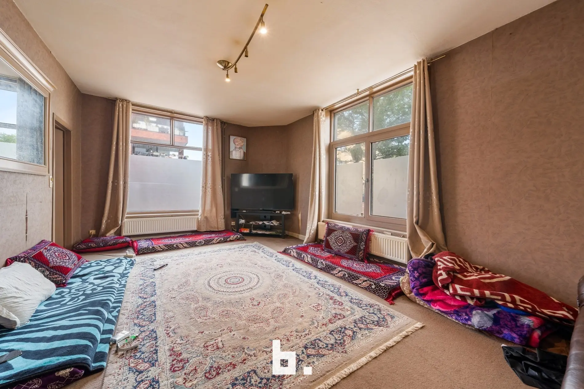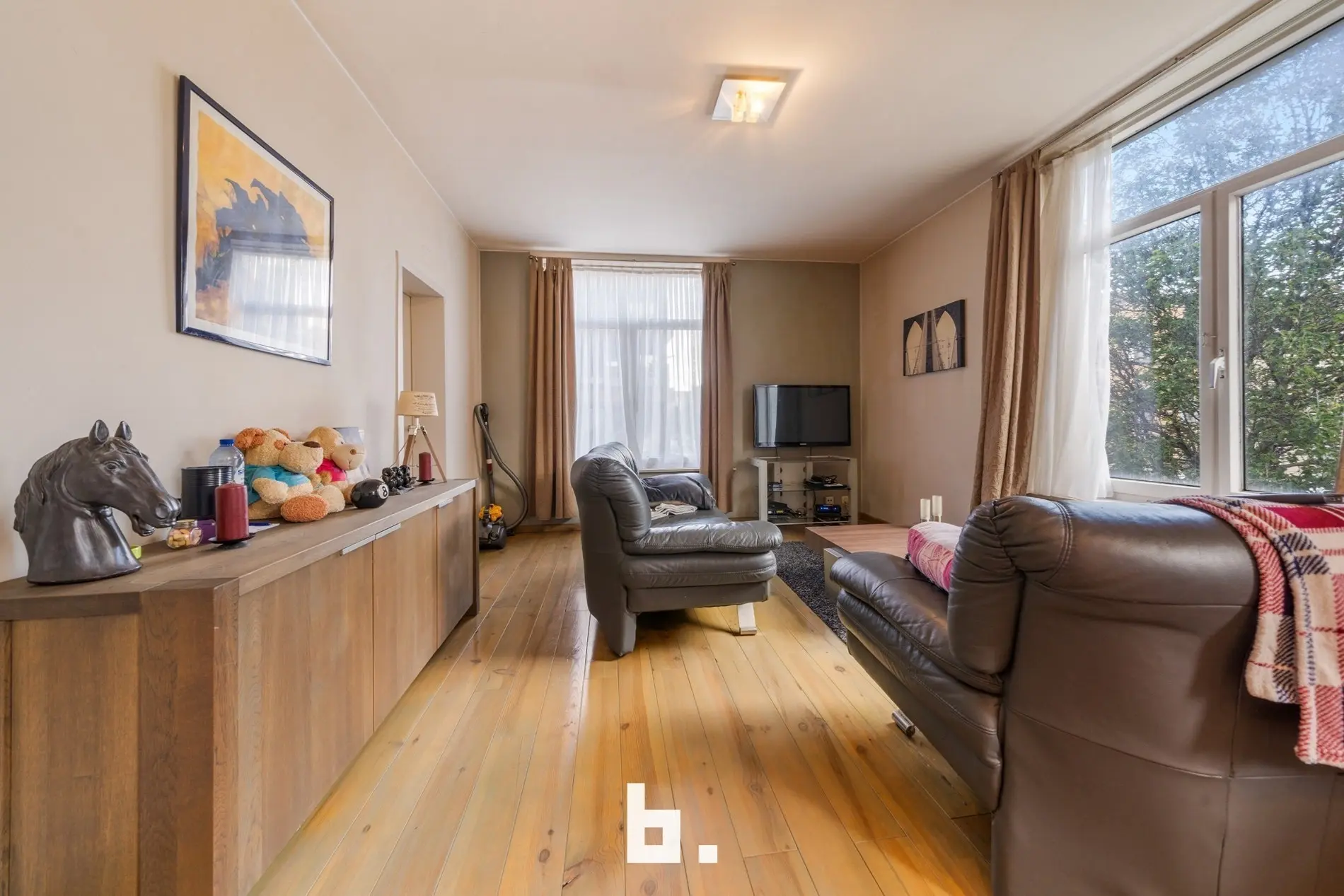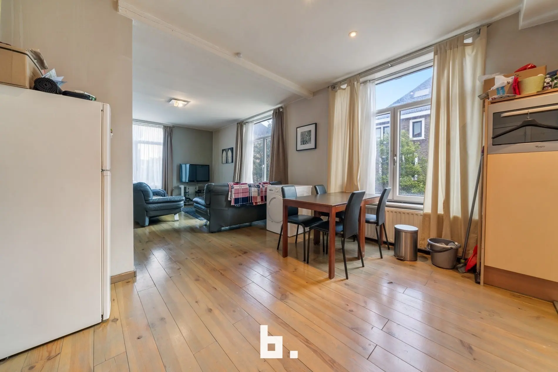 Binnen bevinden zich 3 lichtrijke appartementen die elk een ruime leefruimte hebben en 1 aparte slaapkamer, een ruime berging en badkamer met toilet.