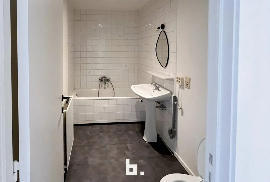 Het appartement omvat een inkomhal, op de 1e verdieping bevindt zich living met open keuken en op tweede verdieping de badkamer met ligbad, lavabo, toilet en 2 ruime slaapkamers.