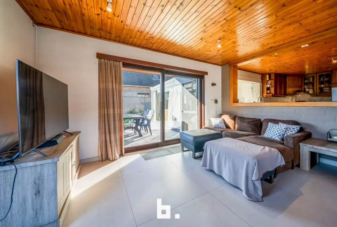 Omvattende op het gelijksvloers: inkomhal met toilet, leef en woonruimte met veel licht inval en zicht op tuin rondom, open keuken met toestellen, veranda met directe toegang naar terras en tuin via schuifraam.